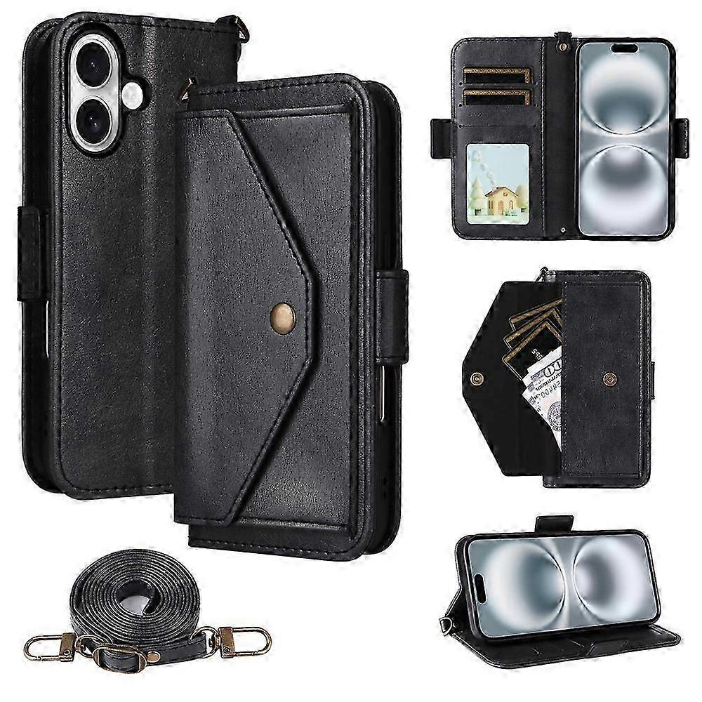 Compatible For iPhone 16 Leather Case Magnetic Closure Wallet Stand Phone Cover with Crossbody Strap