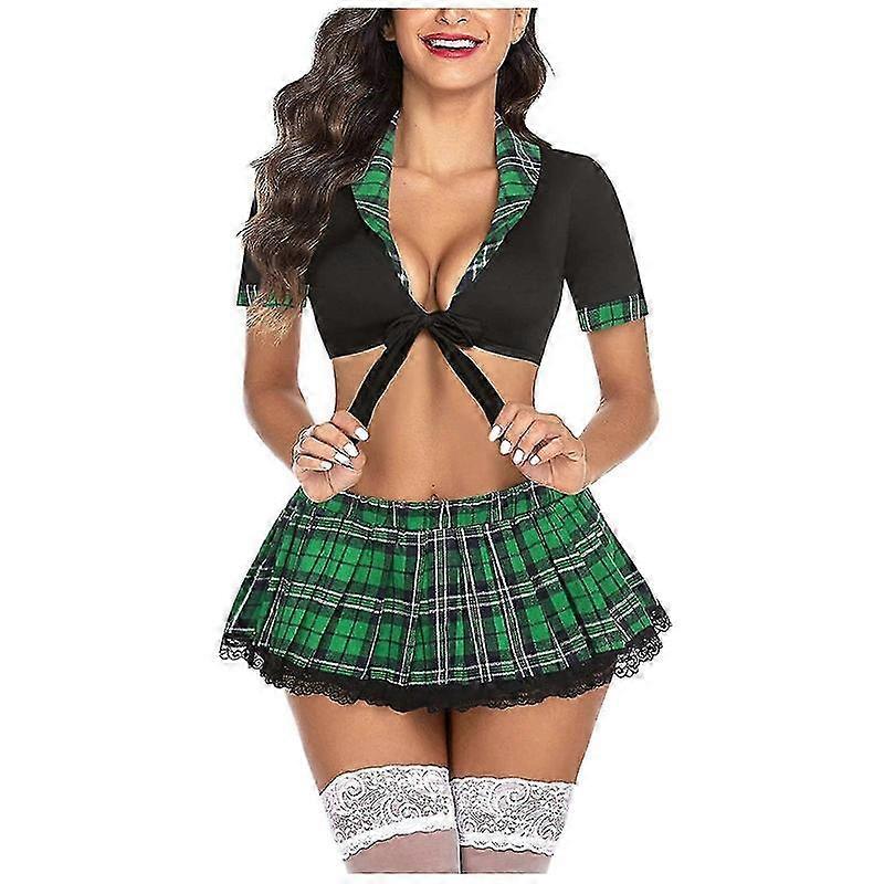 Sexy Schoolgirl Outfit For Women Two Piece Cropped Tops Pleated Skirt Set Naughty Uniform Lingerie, No Stocking