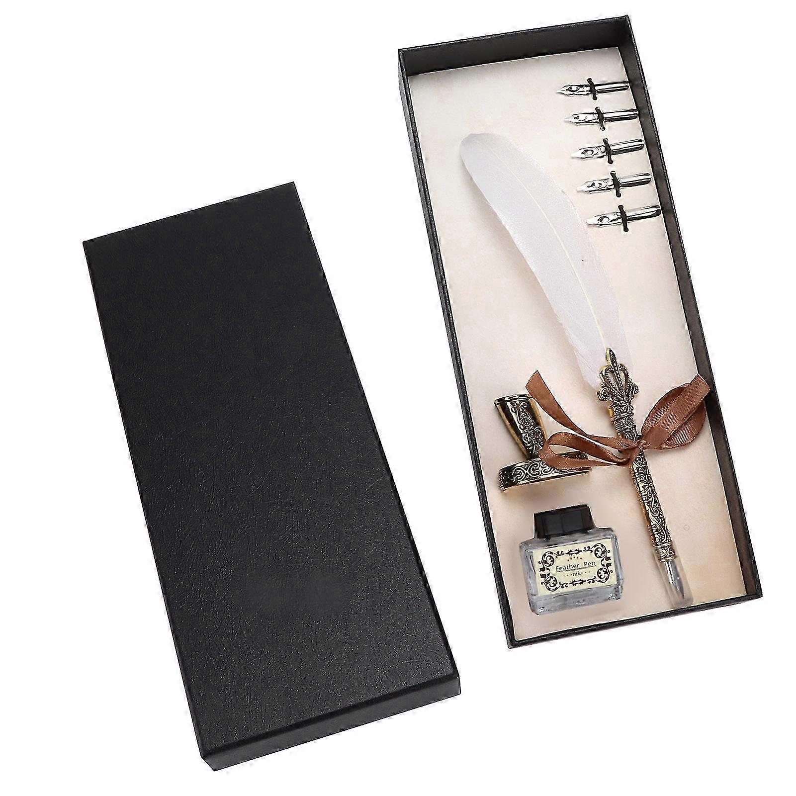 Feather Pen Set Craft Retro Carved Stainless Steel Writing Suit for Signature Gift Table DecorationWhite