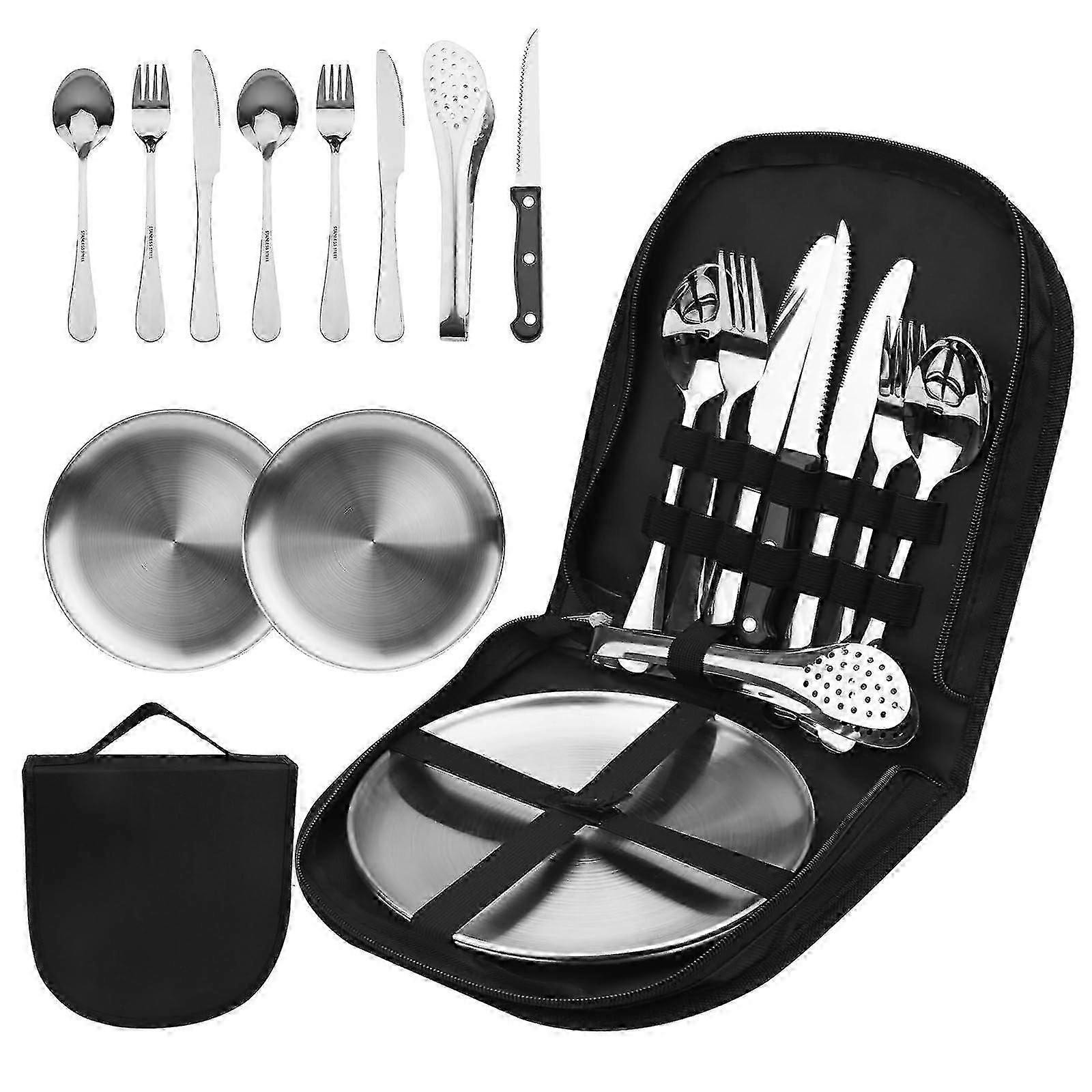 Portable Camping Cutlery Set, 10pcs Stainless Steel Camping Tableware Set with Case Spoons Forks Knife Clip Plate Set for 2 People -ZHENV