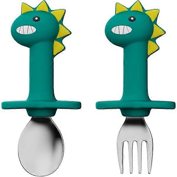 Stainless Steel Cutlery, Fork and Spoon, Safe Children's Cutlery Set, Cartoon Handle, Cute (Green Dinosaur)