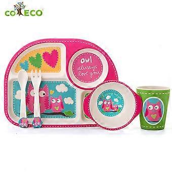 مجموعة أواني الطعام للأطفال من الخيزران - أطباق الأطفال - أطباق طبق الطعام وعاء كوب ملعقة شوكة مجموعة أطباق ، أدوات مائدة كرتونية ، غسالة صحون آمنة للأطفال وقت صحي لتناول الطعام ،