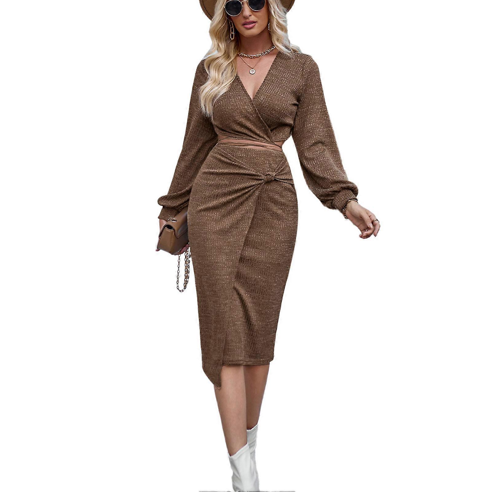 Women 2 Piece Outfit Skirt Set V Neck Long Sleeve Waist Knot Split Slit Bodycon Wrap Skirt Set Brown L