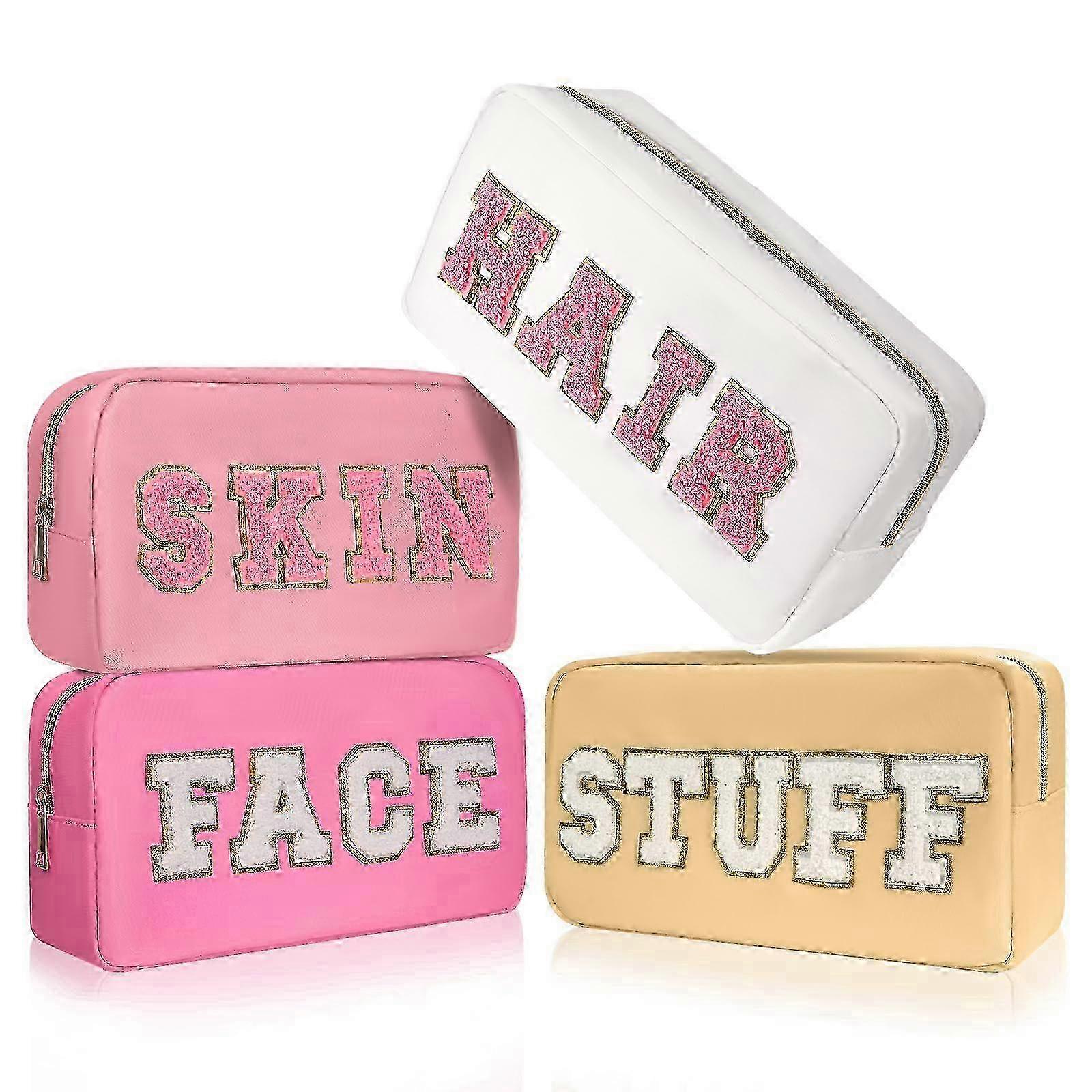 4-Piece Preppy Makeup Bags Set with Chenille Letter Accents & Nylon Zipper for Travel Organization