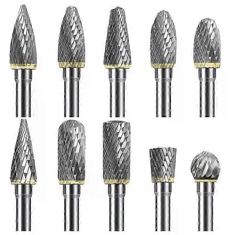 Carbide Burr Set 10PCS 1/8 Shank Double Cut Tungsten Carbide Rotary Burrs Set with Dremel Bits for Metal Wood Carving PolishingWidely Use: Excellent for fine detail work, cutting, engraving, carving, touch-up and finishing high-precision mold cavities.Processing all kinds of metal(including steel, aluminum, etc.) and non-metal (such as marble, jade, bone), and the machining hardness can reach to HRC70.Premium Material: This carbide burr set/rotary bit set is made of premium tungsten Carbide steel which has long working life,it has extremely high hardness and good toughness, machining hardness reach to HRC70. The carbide burr set cut through extraneous material like a hot knife through butter.Double-Cut Design, Efficient Work: Double grooves grinding head adopts the cross-line design, which has the characteristics of fast chip removal.And faster cutting time and better polishing effect, significantly improve work efficiency, the processing efficiency is tens of times higher than the manual file tool,and nearly ten times higher than the small grinding wheel with the handle. The differing profiles let wood carvers or metal engravers trim any shape with ease.Adaptability: Universal size 1/8' shank diameter fits dremel and most small rotary tools with three jaw chuck for accurate centering.An ideal choice for your DIY woodworking, carving, engraving, and polishing. Shank diameter: 3 mm(1/8 inch), Cutting edge diameter: 6 mm(1/4 inch).