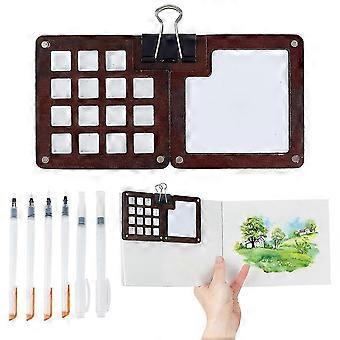 Mini Portable Watercolor Palette Set, 15 Grids Wooden Palette Box Watercolor Paper Pad Watercolor Sketch Book