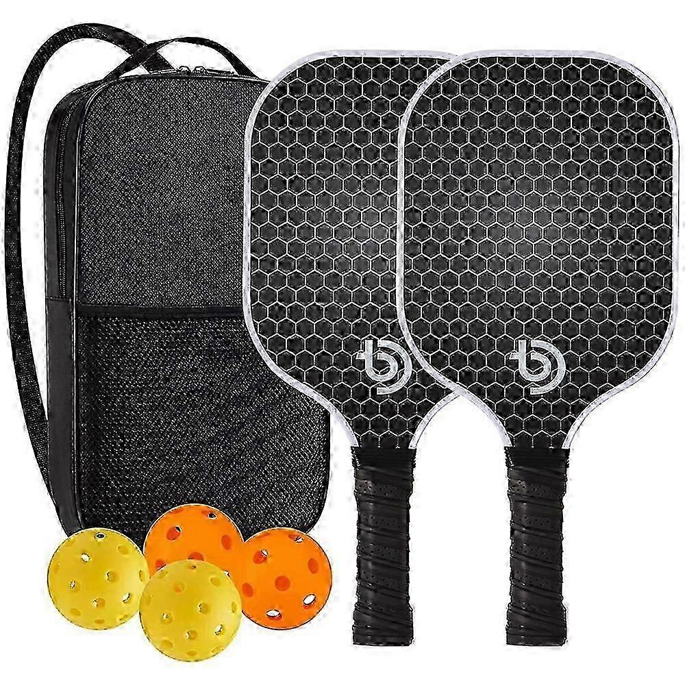 Professional material, lightweight and durable Composite Carbon Fibre + Glass Fibre: The frame is made of composite material and weighs only 7-8 ounces, making it easy to swing and less fatiguing for long periods of time. Polymer honeycomb core: Enhances the strength and hardness of the racket surface, improves stability and extends the life of the racket. Precise ball control and improved technique Scientific Sweet Spot Layout: Expanding the effective hitting area, increasing the error tolerance rate by 30%, reducing the error rate, and helping novices to quickly master the power and angle of the ball. Moderate elastic feedback: clear feel and improved ball control, suitable for all stages from beginner to advanced. Ergonomic design for a comfortable grip Anti-slip cushioning handle: 4.5-inch short handle is designed to fit your hand, and the silicone wrapping is anti-slip and sweat-absorbent, so you can maintain stable control even with sweaty hands. Shock-absorbing structure: Absorbs the impact of the ball, protects the wrist, and enhances the safety of the sport. Portable and practical Rich accessories: Includes 2 rackets, 4 durable training balls and a portable storage bag to meet diversified needs. Suitable for multiple scenarios: Support indoor and outdoor use, and the storage bag is convenient to carry, so you can start training or playing anytime and anywhere.