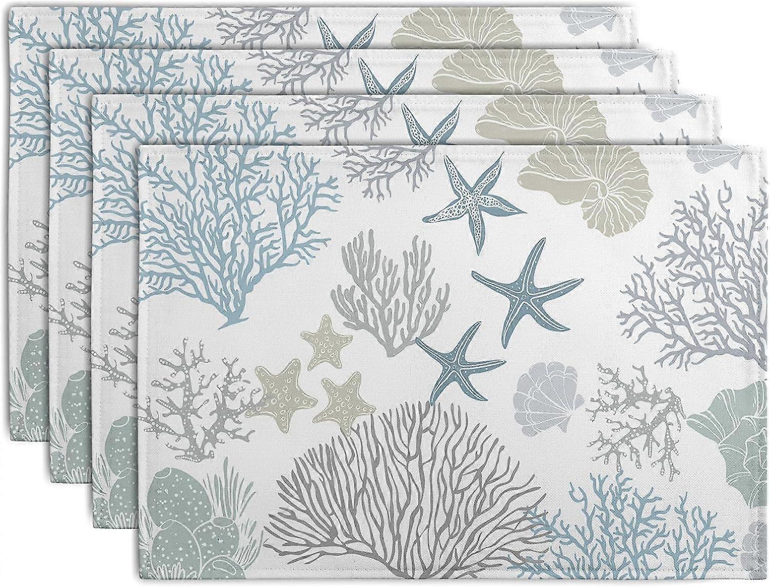 Summer Linen Placemats Set of 4 Nautical Coastal Theme Washable Non-Slip Heat Resistant Table Place Mat 1218 Inch Ocean Beach Blue Grey Coral Starfish