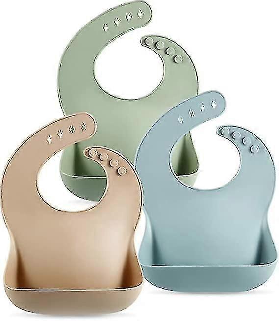 Set Of 3 Cute Silicone Baby Bibs For Babies & Toddlers (10-72 Months) Waterproof, Soft, Unisex, Non Messy (brown/blue/green)