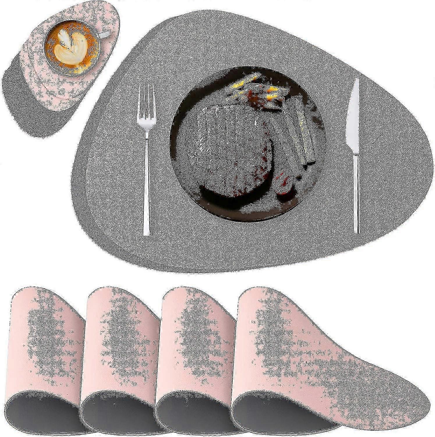 Set Of 4, Pink Gray Washable Placemat And Coaster, Round Leather Placemat, Non-slip And Waterproof Double-sided Placemats