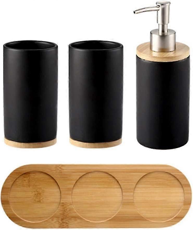 Set Of 4 Ceramic Bathroom Accessories Set, Toothbrush Holder, Soap Dispenser, Tumbler, Bamboo Tray