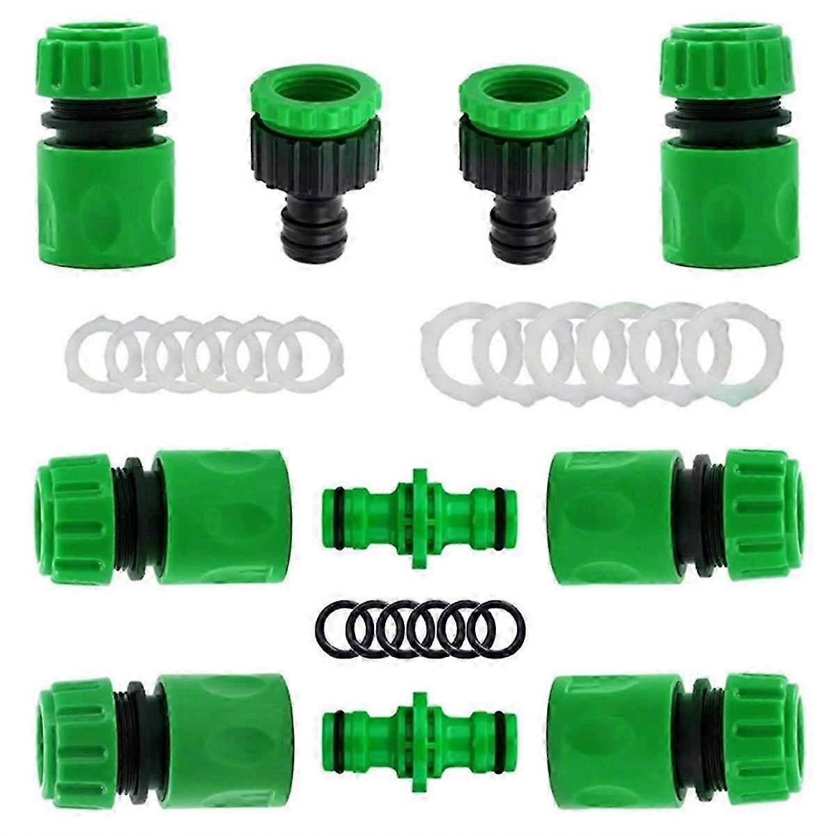 Quick and easy to connect and disconnect the hose connector to the water supply. It can be applied to wash machine, garden hose tap and suitable for most standard garden hose or tap. Robust and rust , help you easily make water system and replace or repair. Package include: 2 x Double Male Connector, 6 x Hose 1/2inch End Quick Connect, 2 x Hose Tap Connector 1/2 Inch(21mm) and 3/4 Inch (26.5mm)Size 2-in- 1, 6 x 1/2 inch Tap Connector washers (19mm), 6 x 3/4 inch Tap Connector washers (24mm), 6 x 'O' rings (16mm) Color: Green Material: plastic Package Contents: 6 * hose connectors 2 * double-ended male connectors 18 * washers 2 * faucet connectors) Only the above package content, other products are not included. Note: Light reflection and different displays may cause the color of the item in the picture a little different from the real thing. The measurement allowed error is +/- 1-3cm.