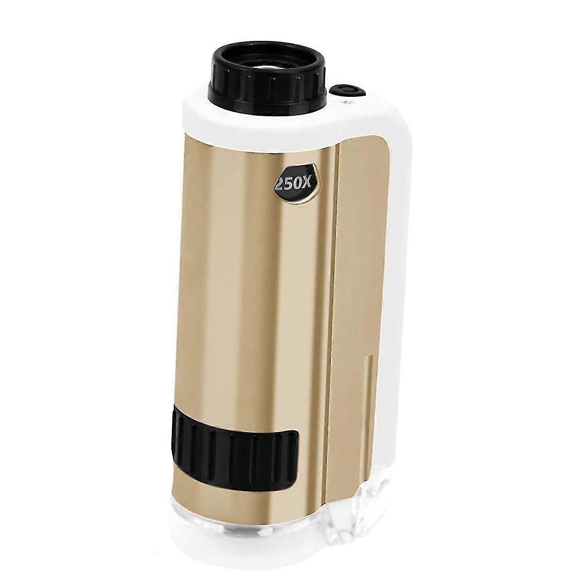 [100x-250x Zoom Pocket Microscope]SETFLAGS LED pocket microscope adopts upgraded optical lens and LED light to provide our young scientists with magnification from 100x to 250x, inspiring children's curiosity to explore the microscopic world. [Fun Educational Tool]As a pocket microscope for or science education, this portable microscope is a great tool for teaching topics in the STEM field. Add this STEM tool to any classroom science toolkit to bring educational content to life. [Portable Handheld Microscope]The handheld microscope is made of alloy material. The mini microscope is equipped with LED light, which is soft and harmless to protect children's eyes. The portable design is suitable for children to hold, making it convenient for children to explore the magical nature. Bring children into the exciting world of science! [Ideal Partner for Outdoor Exploration]This is a great toy that makes your children fall in love with outdoor activities and from screens. This mini microscope will greatly stimulate your children's interest in exploring the outdoor world. It comes with a portable storage bag and a storage rope, which is convenient for your children and their friends to explore the magical world outdoors. [Unique Gift. ]Children can explore the microscopic world with a children's pocket microscope, their curiosity about nature, and cultivate their interest in science effortlessly. Absolutely! This charming gift is irresistible to children. [Note]The LED light is powered by 1 AAA battery (not included). When using the microscope, put the objective lens cover tightly on the object to be observed. Children under 6 years old should use it under the guidance of their parents Colour:Champagne Gold Material:alloy Package Contents: 1 * Mini Microscope 1 * Carry Bag Only the above package content, other products are not included. Note: Light reflection and different displays may cause the color of the item in the picture a little different from the real thing. The measurement allowed error is +/- 1-3cm.