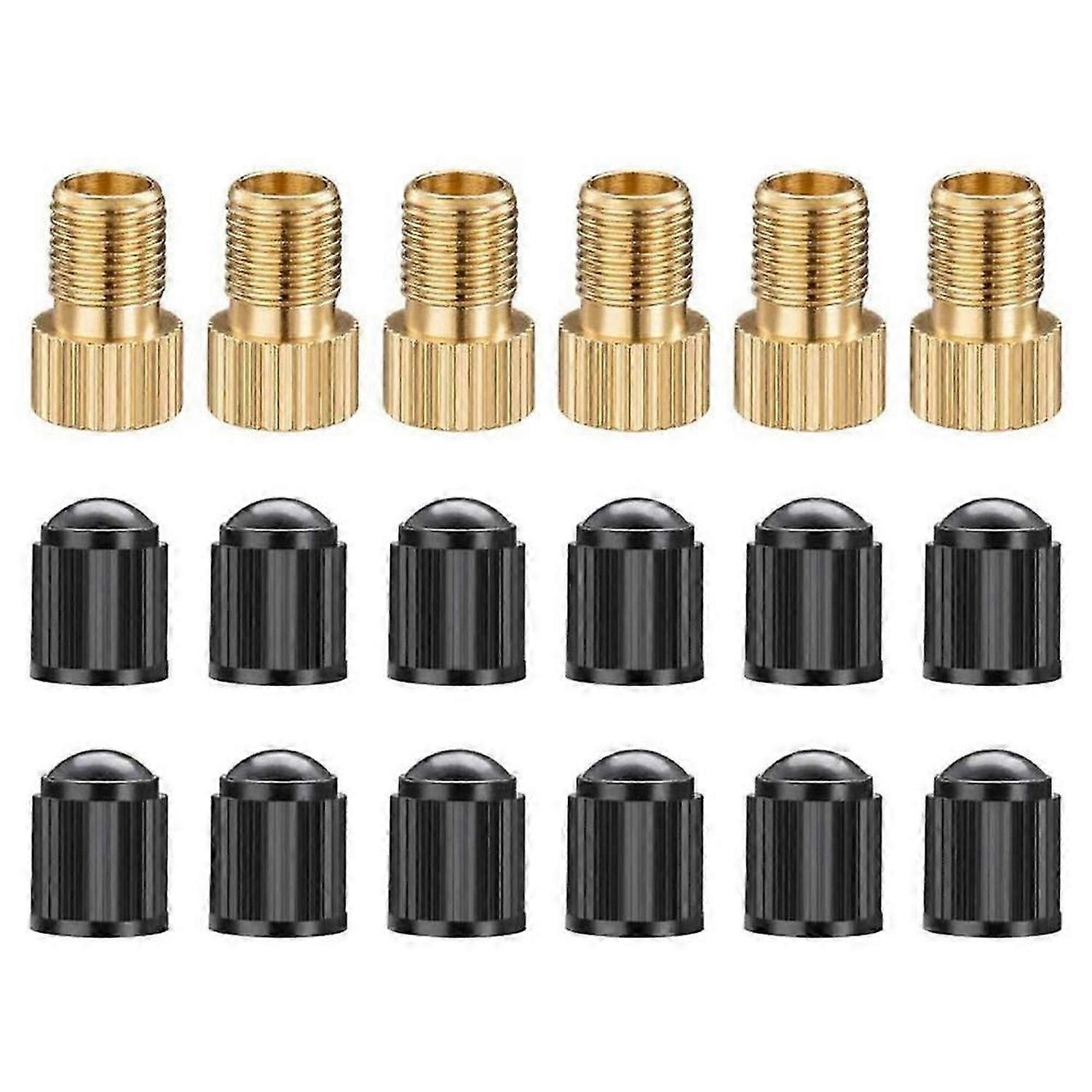 1.[DURABLE]This Bicycle Valve is Made of High Quality Brass and Closely Matched With Rubber O-Ring, Which Can Effectively Prevent Leakage. The Valve Cover Can Prevent it From Being Corroded By Muddy Water. 2.[PRODUCT DESIGN]Lightweight, Portable, Easy to Install, Presta to Schrader Adapter, Just Loosen The Tip of Presta Valve, and Then Screw on The Valve Adapter, Which Can Help you Improve Efficiency and Inflate your Bicycle at any Time. 3.[EXTENSIVE USE]These Valve Stem Adapters are Suitable for Bicycles, Road Bikes, Folding Bikes and Most Mountain Bikes. They are Very Easy to Inflate. Enjoy your Bike Trip With our Accessories. 4. [YOU WILL GET]6PCS From Presta to Schvadr Valve Adapters, 12PCS Presta Valve Covers, Which Will Greatly Meet your Demand. 5.[MULTI-PURPOSE ADAPTER]The Bicycle Valve Can Be Converted Form Presta to Schwader, Which Can Be Used to Inflate Tires With Various Standard Pumps or air Compressors. Product description I wish all the bicycle lovers over the world can enjoy the happiness ,I am deeply honored. Colour:Gold + Black Material:metal + plastic Size:outer diameter 9.9mm, length about 12.7mm<br><br>Package Contents: 6 x Presta to Schrader valve adapters 12 x plastic Presta valve cover