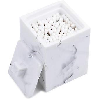 This square qtips holder can contain cotton swabs rounds balls makeup sponges pads bath salts Its also a nice cotton swab organizer that comes with a lid, so this storage container can keep the qtips pads ball, toothpicks swab clean and dry Made of marble-imitated resin and laminated for moisture resistance, holds up well to daily use Inner Size: 2.3x2.3x3.1(LxWxH) , can hold Qtips no longer than 3.1 Accessories in the pictures not included.