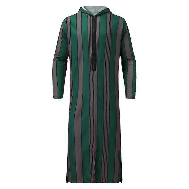 Muslim Mens Arabic Striped Hooded Long Sleeve One Piece Zipper Robe Kaftan