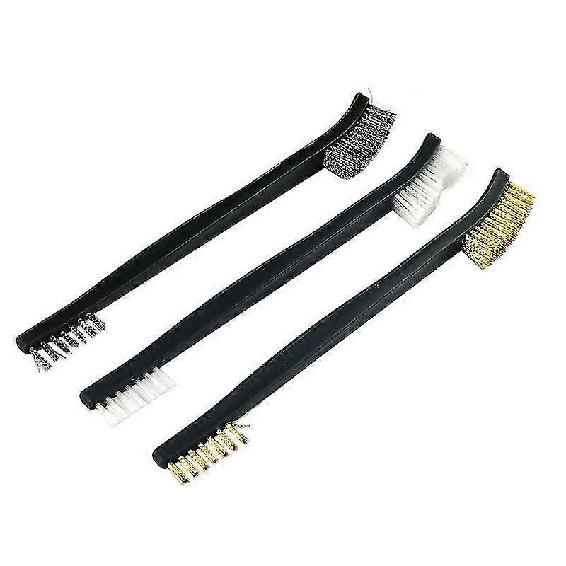 BAZHOU Mini Wire Brush Set, Rust Paint Metal Cleaner, Cleaning Welding Slag and Rust, Handy Steel/Nylon/Brass Brush Set Suitable for Nylon Brush - Easy on finished surfaces making them ideal for sweeping away dirt and debris from around interior door panels, trim pieces, dashboards. Brass Brush - Clean unfinished metal parts like screw threads, connection terminals, and cutting tools without damaging surfaces or fine features. Stainless Steel Brush - Good for cleaning and removing loose paint, scale and rust from metal parts and heavy duty scrubbing. Widely Used - Great for cleaning steel parts, machinery, the unfinished metal parts, paint stains, special corrosion, etc. Color: Multicolor Size: about 17CM long Quantity delivered: 3 pieces Warm prompt: 1.As different measuring methods,it will occur 1-3 cm deviation about the items,please ensure that it is okay for you before ordering. 2. Because of different monitors and lamplight, the picture may not reflect the actual color of the item, really thank you for your kind understanding 3. Only the above package contents, excluding other products.