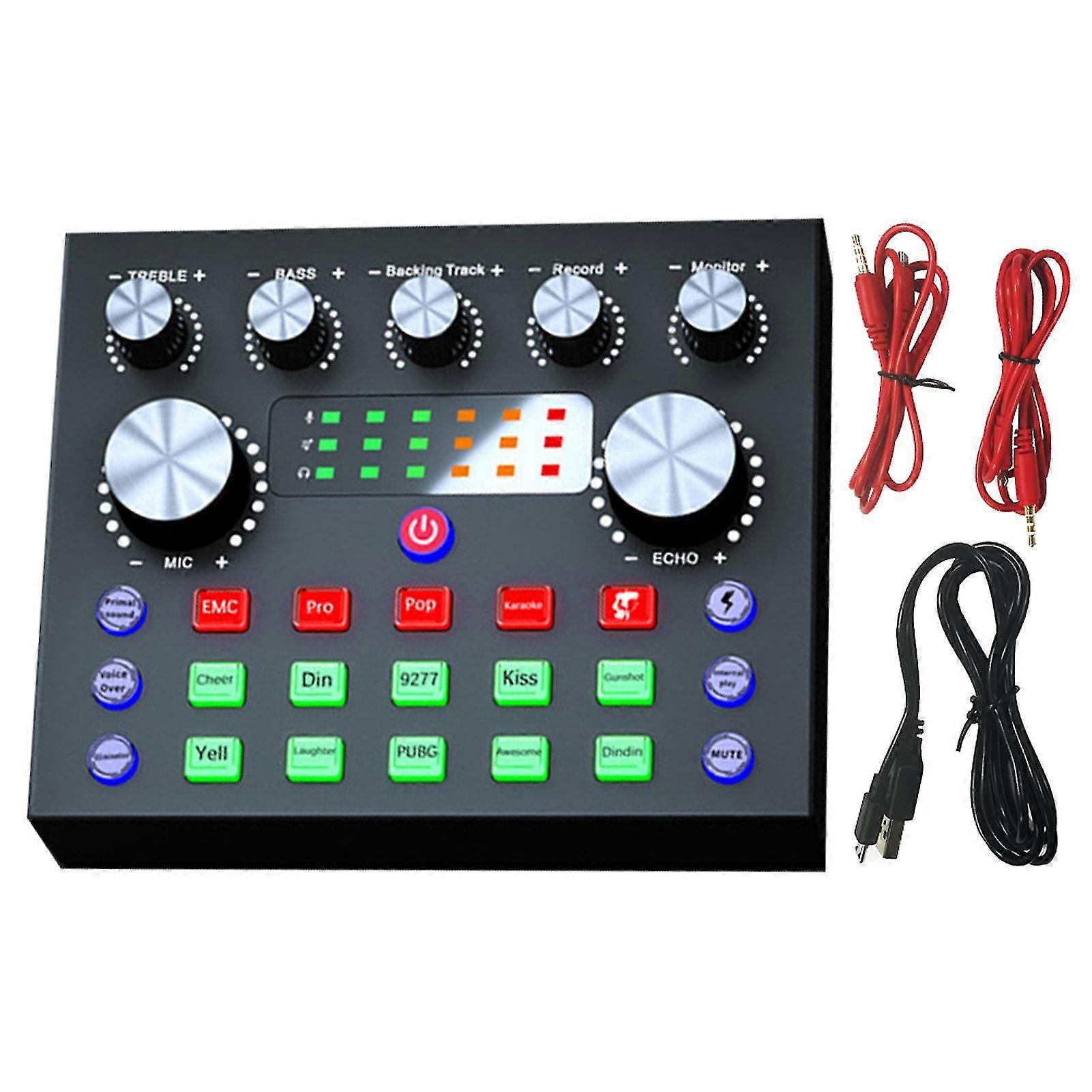Features: Independent Adjustment: Sound effects are adjusted independently,allowing you to easily play the music phantom sonic boom, lots of warm-up effects,everything you want. Real-Time Calibrarion: Live the sound of sung by listening to headphones return to your own ears, real-time calibrarion to avoid off-key. Supported Devices: Compatible with computers, mobile phones, and tablets, with high compatibility, supporting most mainstream systems, such as for Android, for Win7/8/10, etc. Upgrade DSP Audio Chip: Can timely a adjust the rhythm, make audio signal more clear, output-sound mellow stereo. 7 Major Modes: All kinds of scenarios can be used one button operation, novice can learn. With Bluetooth indicator: The Bluetooth indicator light flashes when the phone is turned on pairing. indicator light is always on after successful connection. Features: Large knob adjustment, Independent adjustment of mid, high and bass, 10 kinds of sound effects, Bluetooth wireless accompaniment, colorful lighting. Specifications: Type: Live Sound Card Bluetooth Version: BT 5.0 Material: Plastic Color: Black Size(L*W*H): About 130x105x25mm/5.12x4.13x0.98inch Battery Capacity: 800mAh(built in) Interface: USB Package Included: 1pc x Live Sound Card 1pc x Charging Cable 1pc x Live Cable 1pc x Accompaniment Cable 1pc x English Manual