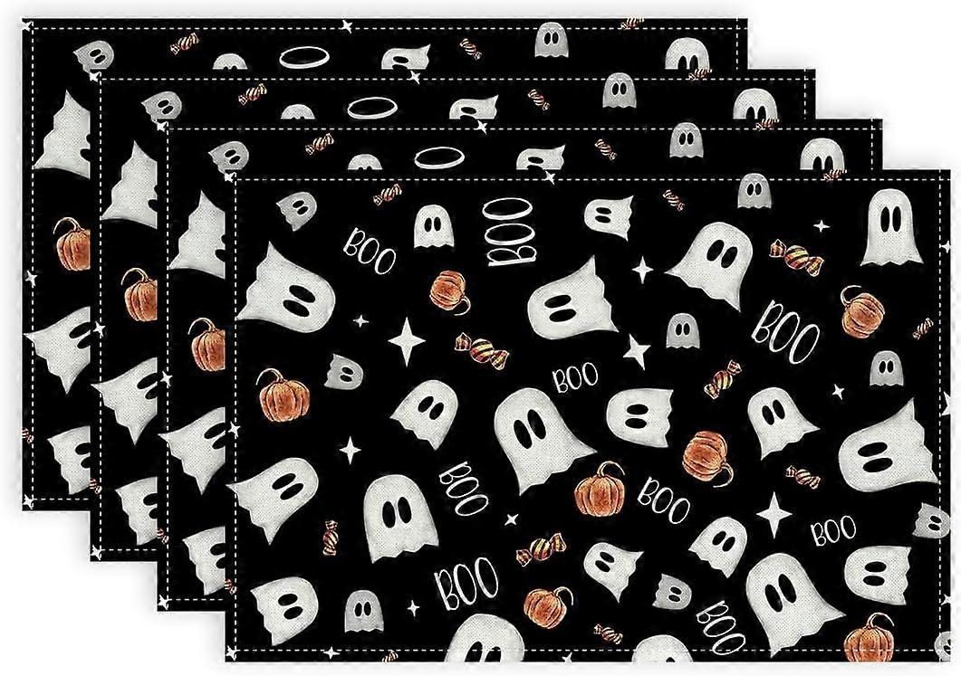 Halloween Placemats 12x18 Inch, 4-Pack, Pumpkin Ghost Candy Boo, Seasonal Burlap Farmhouse Indoor Kitchen