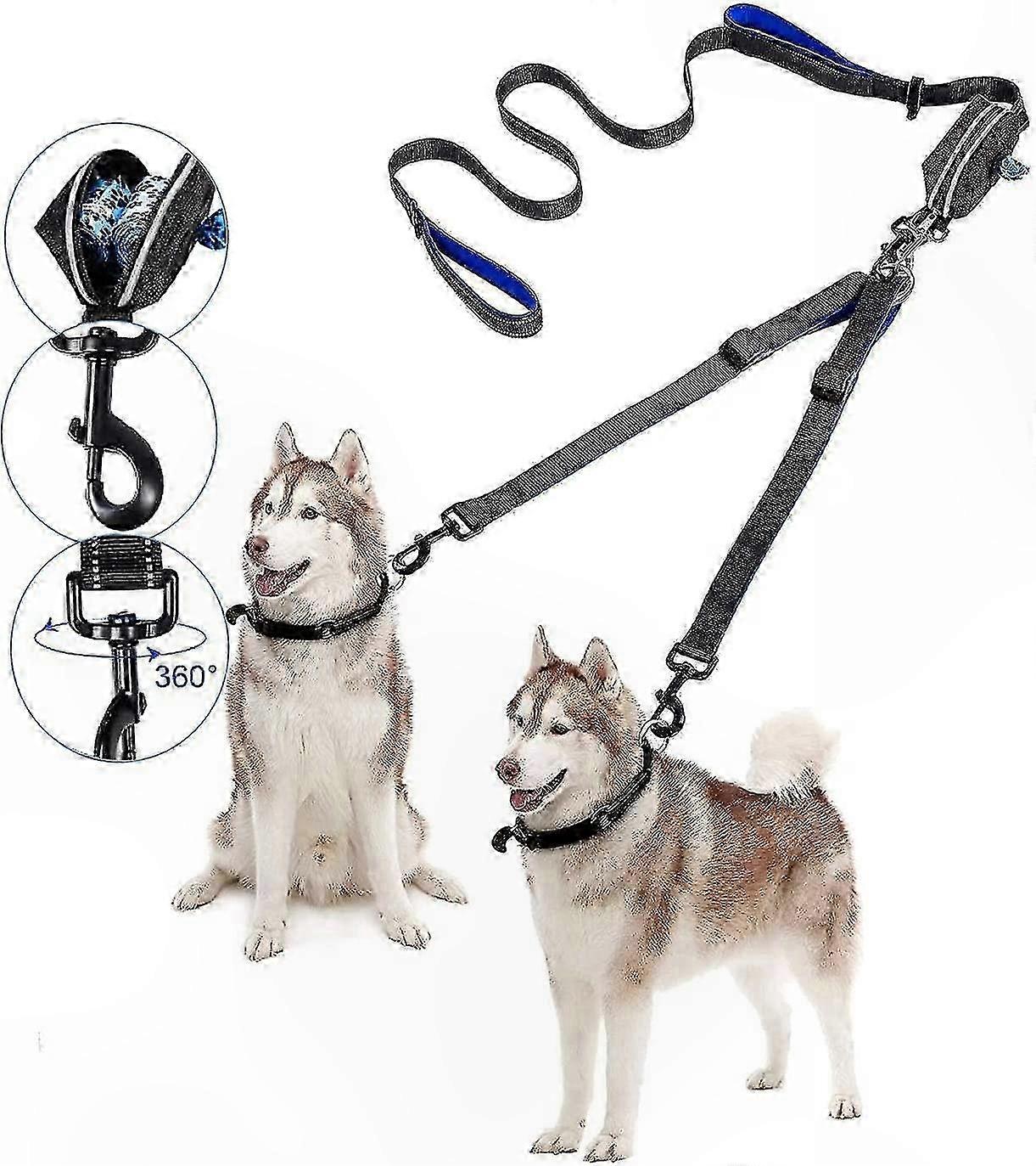 Adjustable Dual Dog Leash with Poop Bag Dispenser, Reflective Tangle-Free Design for Two Large Dogs Up to 50kg/180lbs, 6.6ft Length