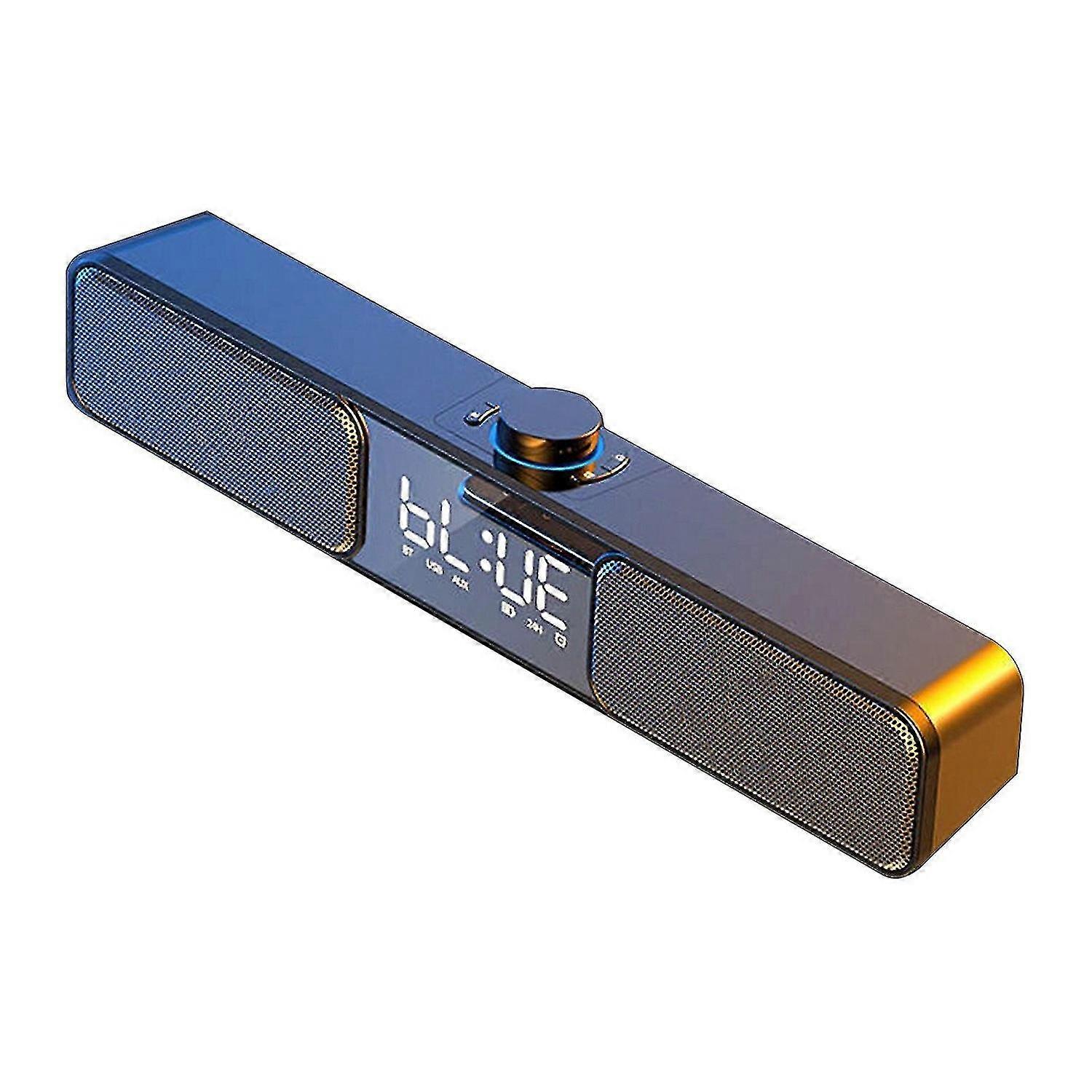 Bluetooth Speaker LED Large Display Multi-function Computer Audio Four-unit Sound Stereo Surround Sound Effect Subwoofer Antimagnetic Noise Reduction Feature: Product type:Bluetooth speaker Material: ABS Product colour:Black Packing size:39x8.8x8.8cm/15.3x3.4x3.4in Gross weight: 550g/1.21lb Output power :10W2 Effective distance:10m Frequency response range:150Hz-20KHz Power input:5V Extended storage:32G (not included) rating: IPX5 Battery capacity: 1800mAh Bluetooth version: 5.0 F1800mAh batteryThe built-in large capacity battery has strong battery life, It can be used unplugged ,which can play music for up to 12 hours. Alarm clock functionIt is both a speaker and an alarm clock. The dual alarm clocks can be set independently to meet your different needs. Humanized design allows you to control every time as you like. Full frequency omnidirectional stereo horn2 forward speakers, 2 backward diaphragm, audiovisual shock, high and loudly bass full, 8D stereo field, presenting higher quality sound quality. Compatibles within most devices in the marketWidely compatible does not pick devices, support wired/wireless Bluetooth connection two ways, Support most mainstream karaoke software, let you enjoy. Antimagnetic design is not affected by currentTo overcome the constant current noise problem, the use of antimagnetic core piece, double magnetic circuit design, positive and negative electromagnetic offset, 360 degree all-round antimagnetic, no longer worry about the interference brought by mobile phones and computers. Tabletop art is minimalist and versatileMetal mesh, streamline design, simpler and generous, with LED mirror design decoration more grade, home, entertainment, office is a goods choices. Package Included: 1Bluetooth speaker 1Operating manual
