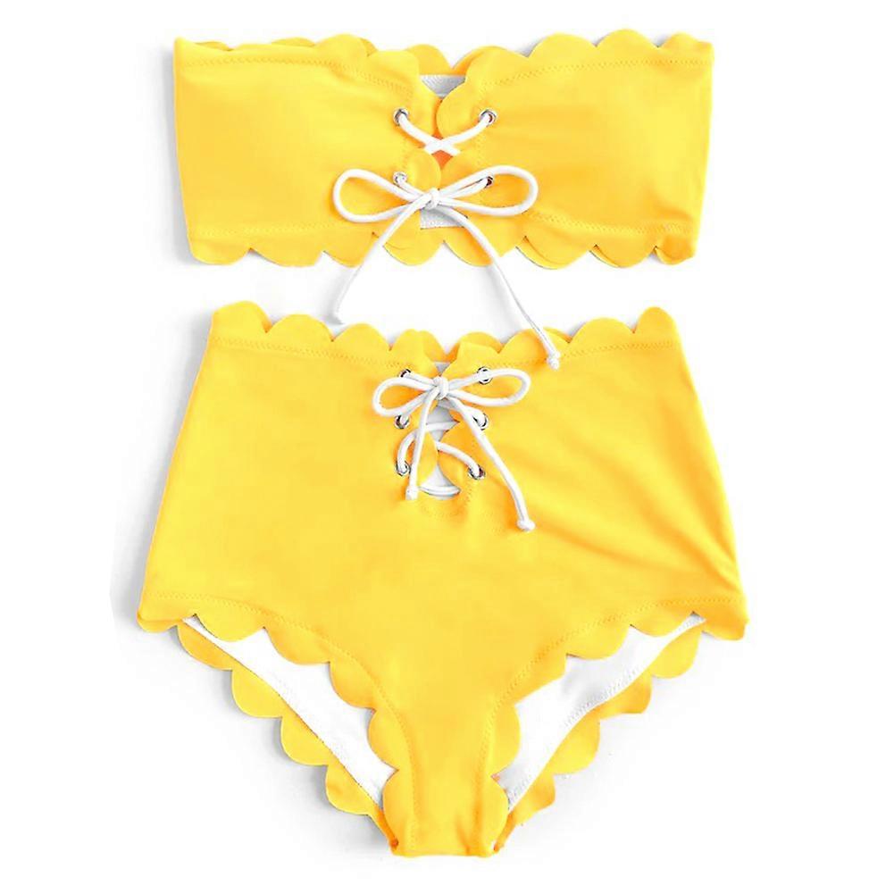 Women Two-Piece Solid Color Off Shoulder Bandage Swimsuit Separate Bikini Swimwear (Yellow S)