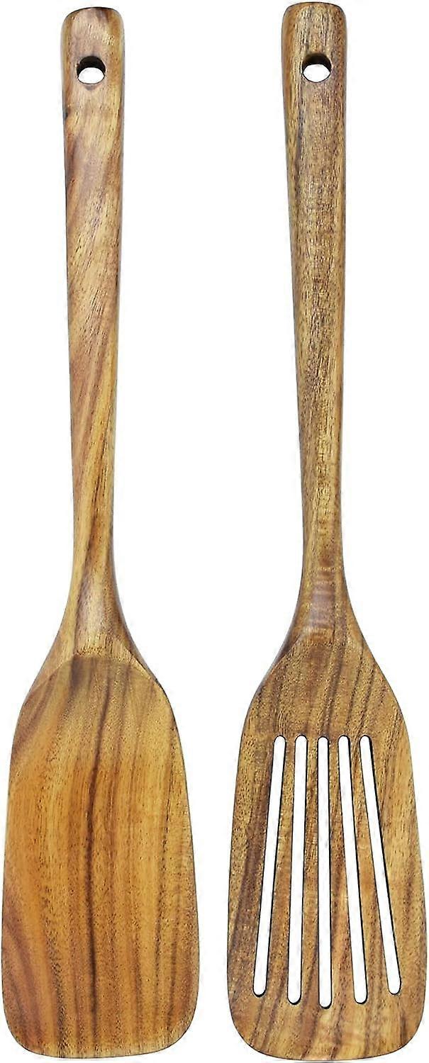 Wooden spatula and slotted spatula: Made of 100% natural teak. Hard texture, good stability, high temperature resistance, not easy to crack, not easy to deform. Teak naturally has anti-corrosion, moisture-proof, insect-proof, and is the best choice for wooden kitchen utensils. Safe and durable: it is made of natural wood , not metal, efficient in action, the spatula works well for tossing and turning ingredients without scratching non-stick woks or scraping carbon steel foods. The 13.3" length keeps hands comfortably away from heat without sacrificing control and the material is moisture resistant. Perfect for the Kitchen: A durable hardwood piece that will not scratch the surface of cookware. Large comfortable handle. Ideal for scraping, mixing, tasting. Elegant enough to serve. Stores neatly in a kitchen drawer or on the counter in a utensil holder. Space-saving hanging hole: Each spatula comes with a hanging hole to save space in the kitchen. The hanging hole is large enough for any thick rope or leather rope. 100% easy to maintain: wash them with warm water and a soft sponge to preserve their qualities. We recommend hanging them dry. If there is anything sticking to our kitchen utensils, just put them in water for 5 minutes before washing. Please store them in a dry place when not in use.