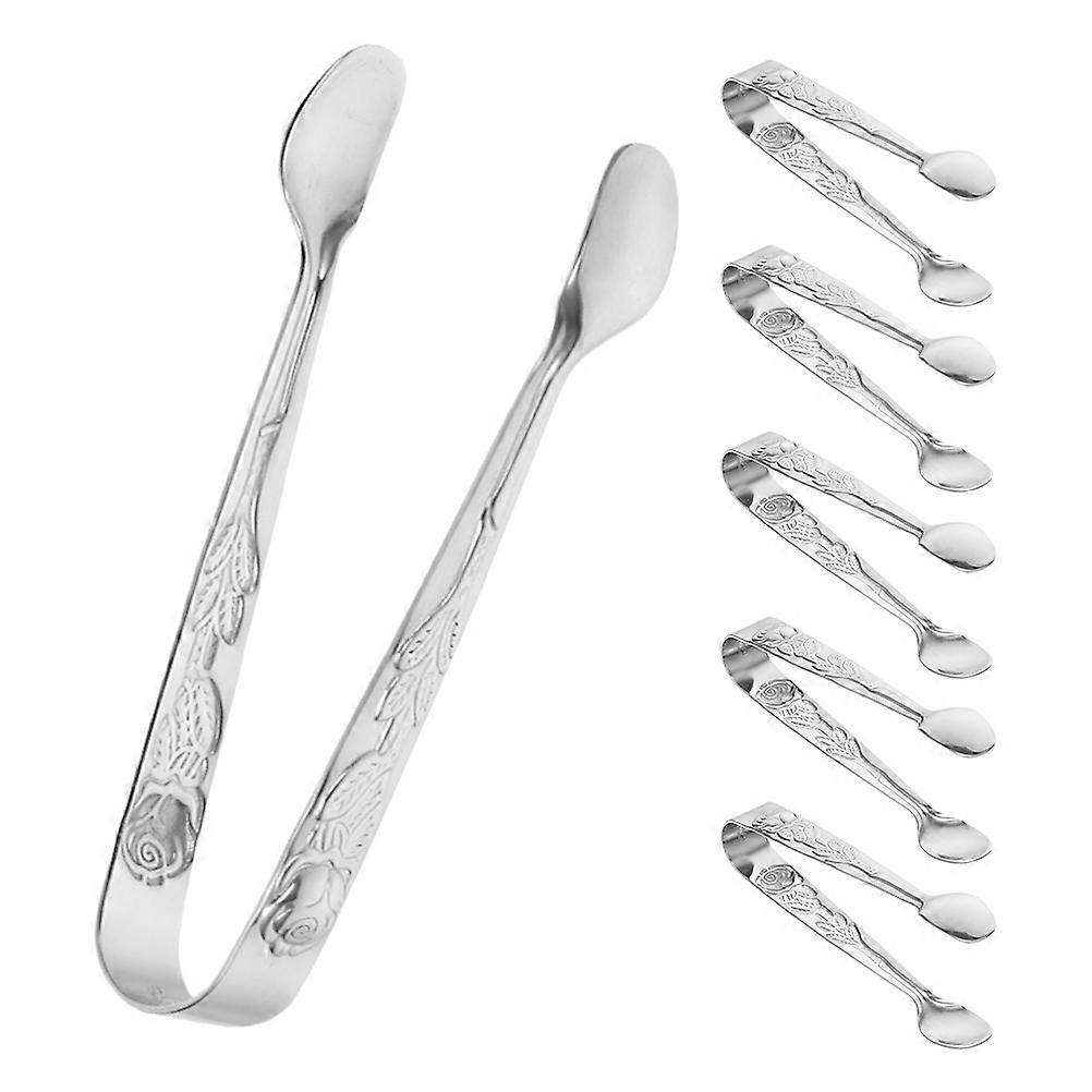These mini stainless steel tongs with rose design are ideal for any tea party or coffee . Use them to serve sugar cubes, ice cubes, or small snacks with ease. Their practical construction and elegant design make them a practical and stylish addition to your kitchen tools, ensuring you can serve your guests with both functionality and flair. Features -Color:Silver -Material:Stainless steel -Size:10.50X5.00X1.70 cm/4.13X1.97X0.67in -Fine construction: crafted from stainless steel, these small kitchen tongs are designed to withstand frequent use, offering a reliable and sturdy option for serving. -Charming aesthetics: the beautiful rose design on these tongs adds a decorative touch, making them a delightful addition to your coffee or dessert table -Multipurpose functionality: whether you're hosting a tea party or a family dinner, these tongs are ideal for serving sugar cubes, ice cubes, appetizers, and more, making them highly versatile -Userfriendly design: the tongs feature a practical and easytouse design, allowing you to up and serve food items with precision and ease, enhancing your dining experience -ideal for entertaining: this set of tongs is ideal for entertaining guests, providing enough tools to serve multiple dishes simultaneously, making your gatherings more enjoyable and efficient Package list: 6 x stainless steel ice tongs