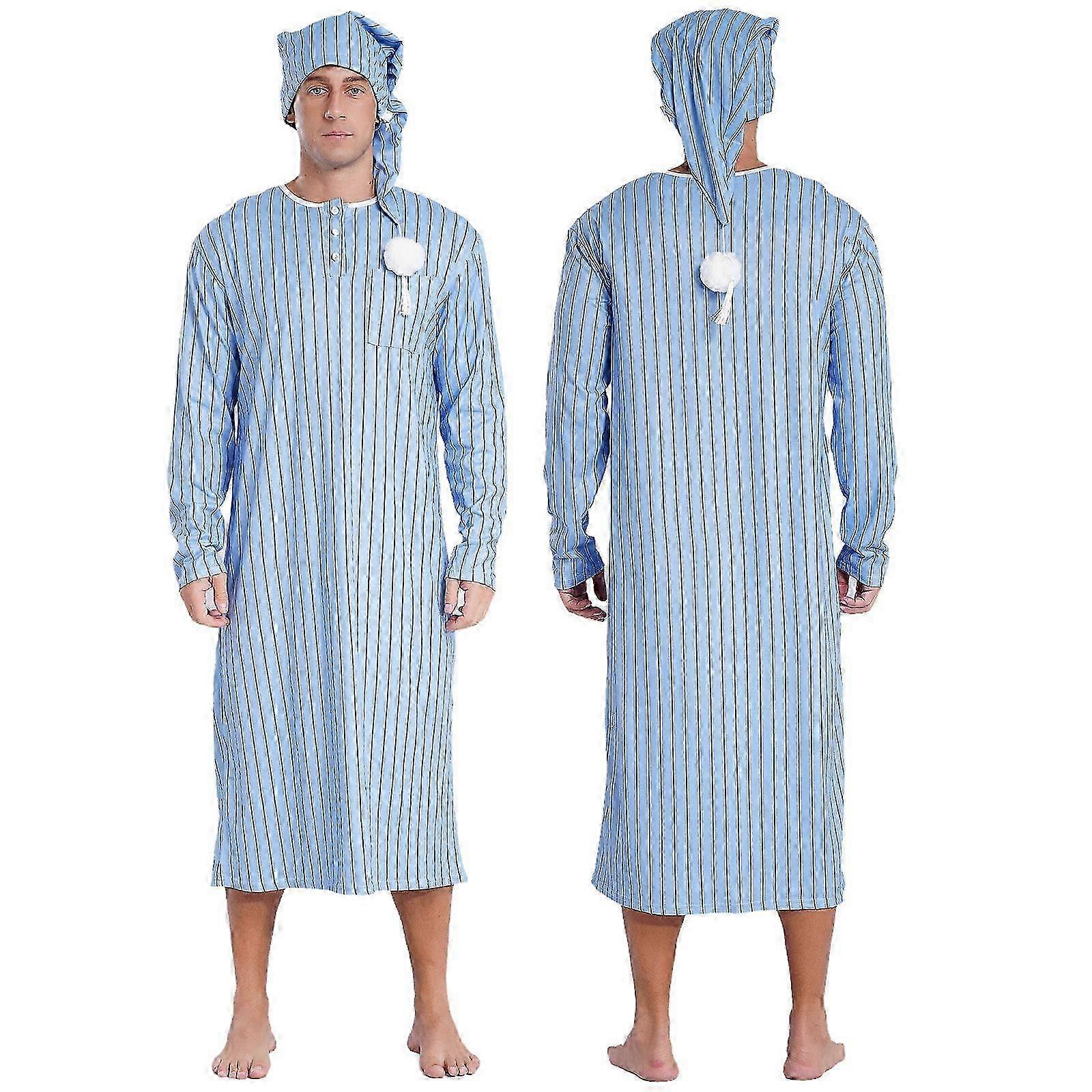 suitable for Men's Henley Sleep Shirt Nightgown Striped Big&Tall Long Sleeve Nightshirt with Night Hat-jc