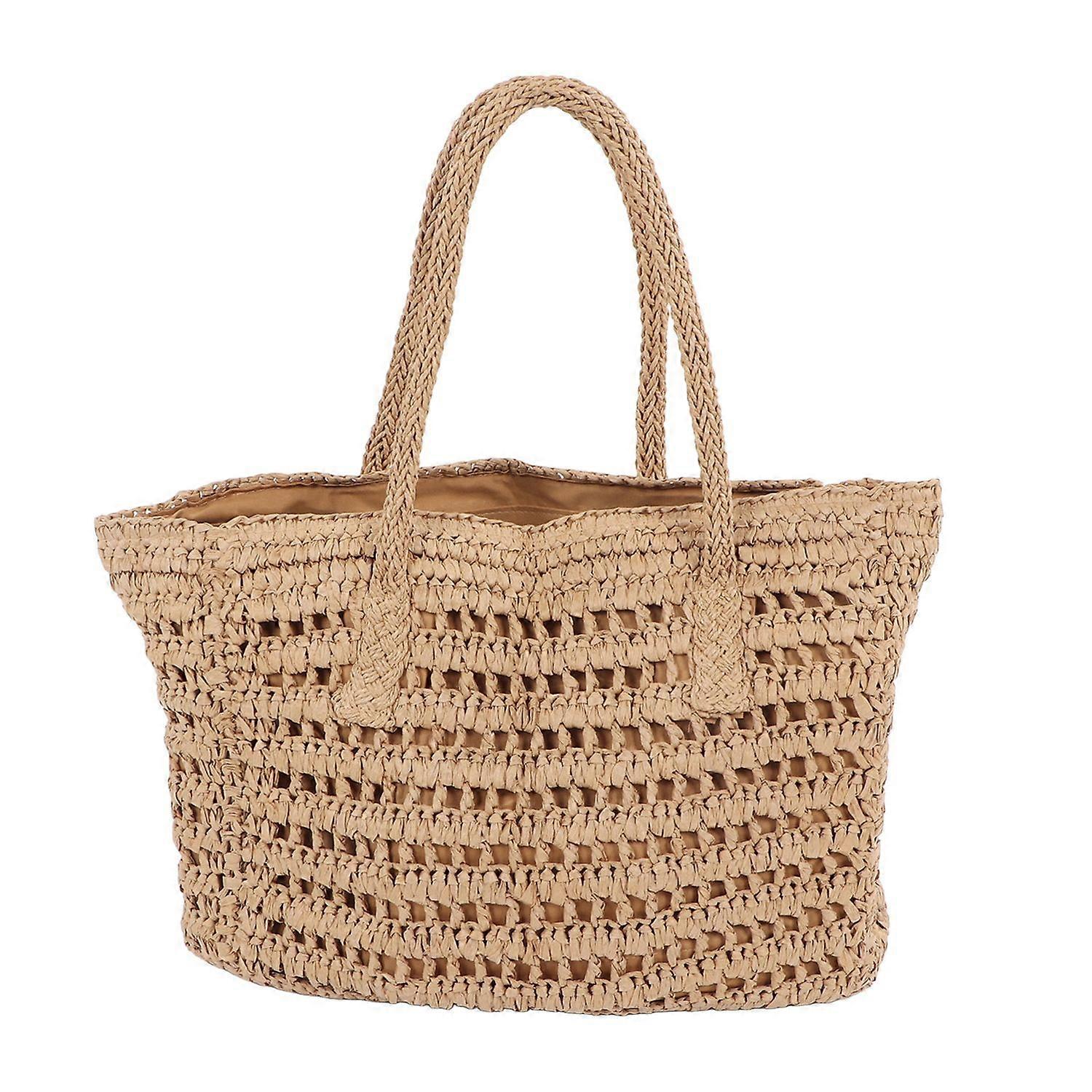 Woven Straw Large Bag Vintage Hollow Out Double Handle Zipper Inner Pocket Straw Shoulder Bag Coffee