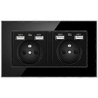 Two-slot Electrical Outlet With 4 Usb Ports Glass Panel Wall Power Plug Socket