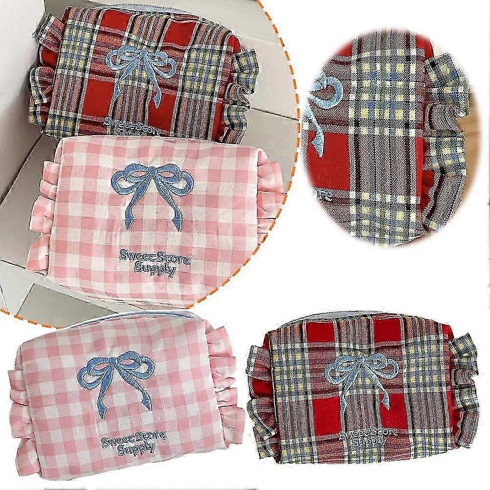 "Plaid Bow Storage Bag Women's Storage Bag Sweet Ruffle Girls Cosmetic Bag"