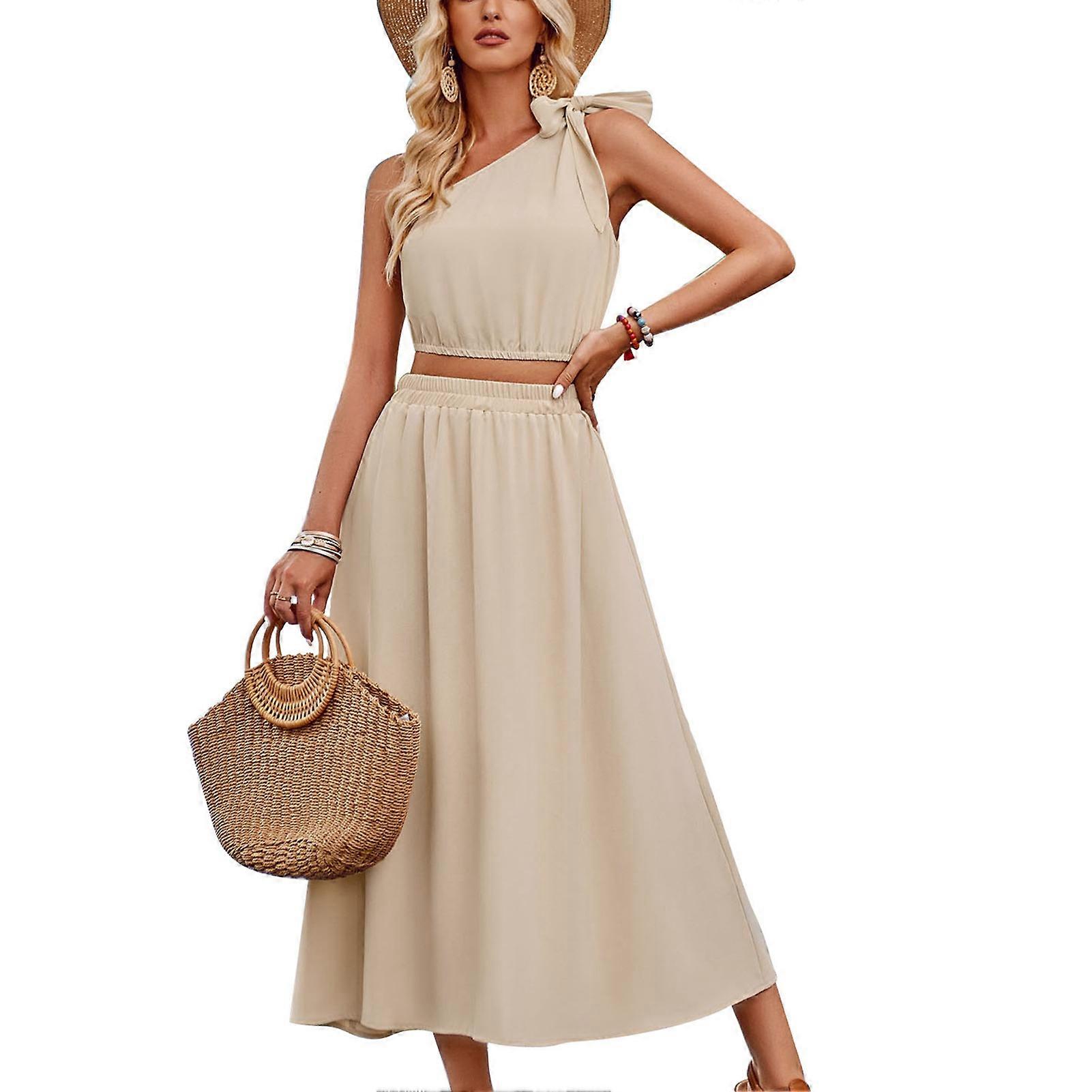 Women One Shoulder 2 Piece Dress Pure Color One Shoulder Crop Top Long Skirt Set for Beach Apricot S