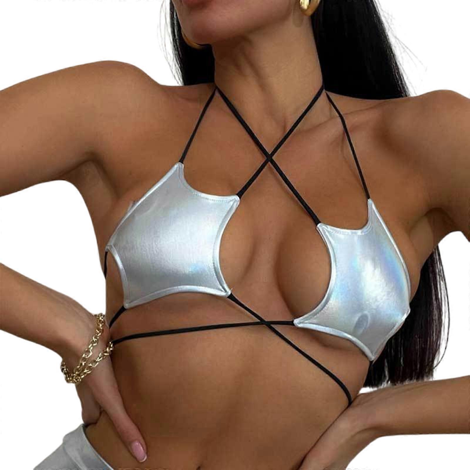 Women Shines Metallic Star Strappy Tube Top Halter Rave Wrap Around Bandeau Bra Camisole Colorful white S