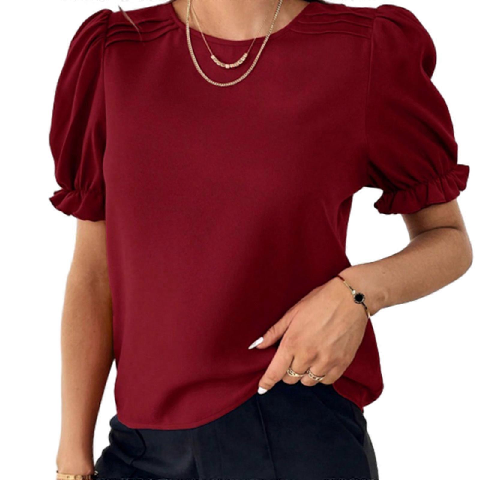 Women Summer Short Sleeve Crewneck Loose Shirt Top Ruffle Puff Sleeve Pleated Shoulder Keyhole Back Solid Color Blouses XL Burgundy