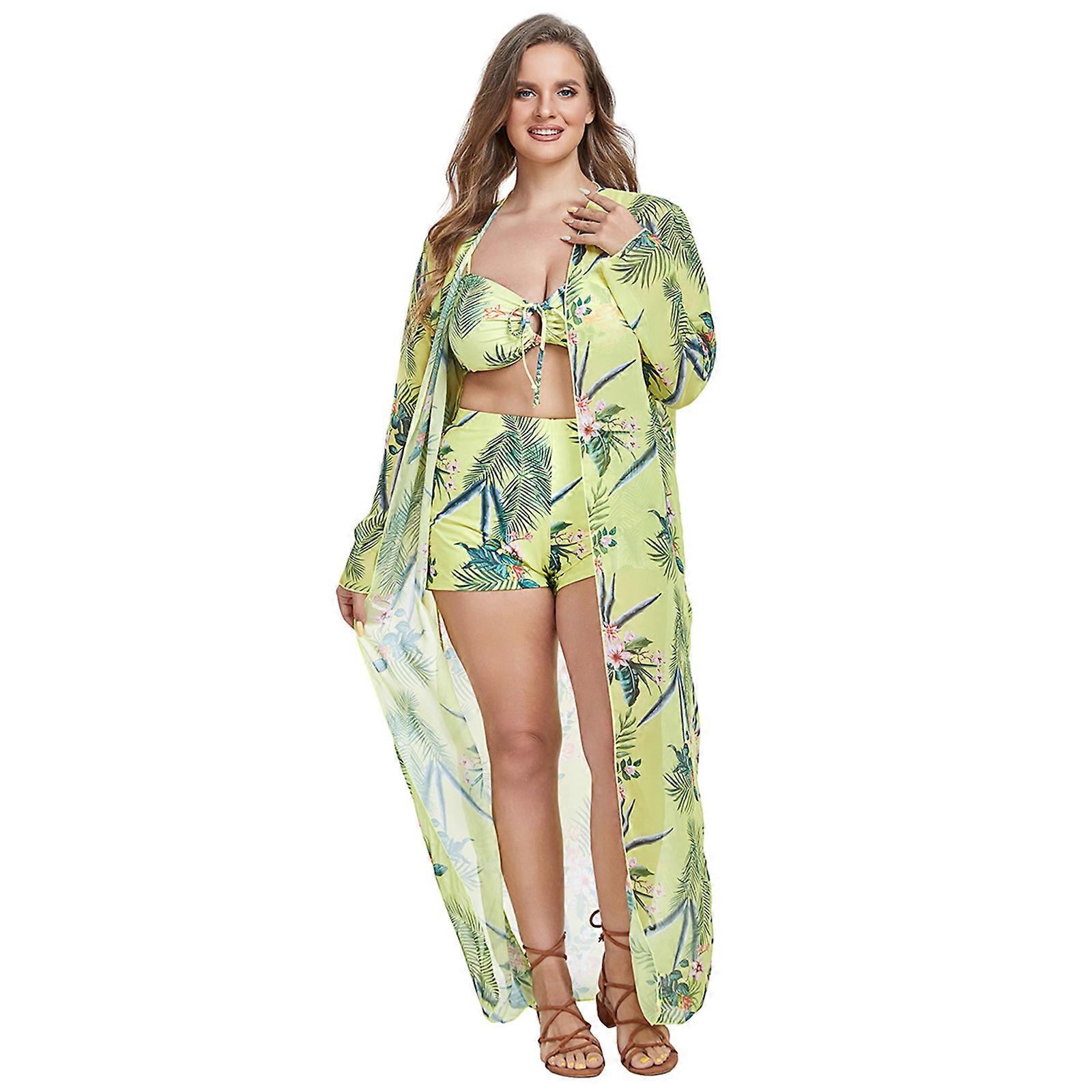 Women Bikinis Bathing Suit with Long Bikinis Cover Up Cardigan, Floral Print Swimming Costume Tummy Control Swimwear Yellow XL