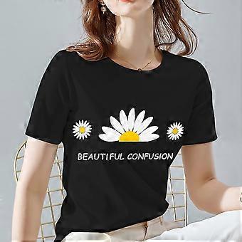 Women T-Shirt Vintage Daisy Flower Pattern Print Series Summer Black All-match O Neck Short Sleeve Tees Casual Tops XXS-3XL