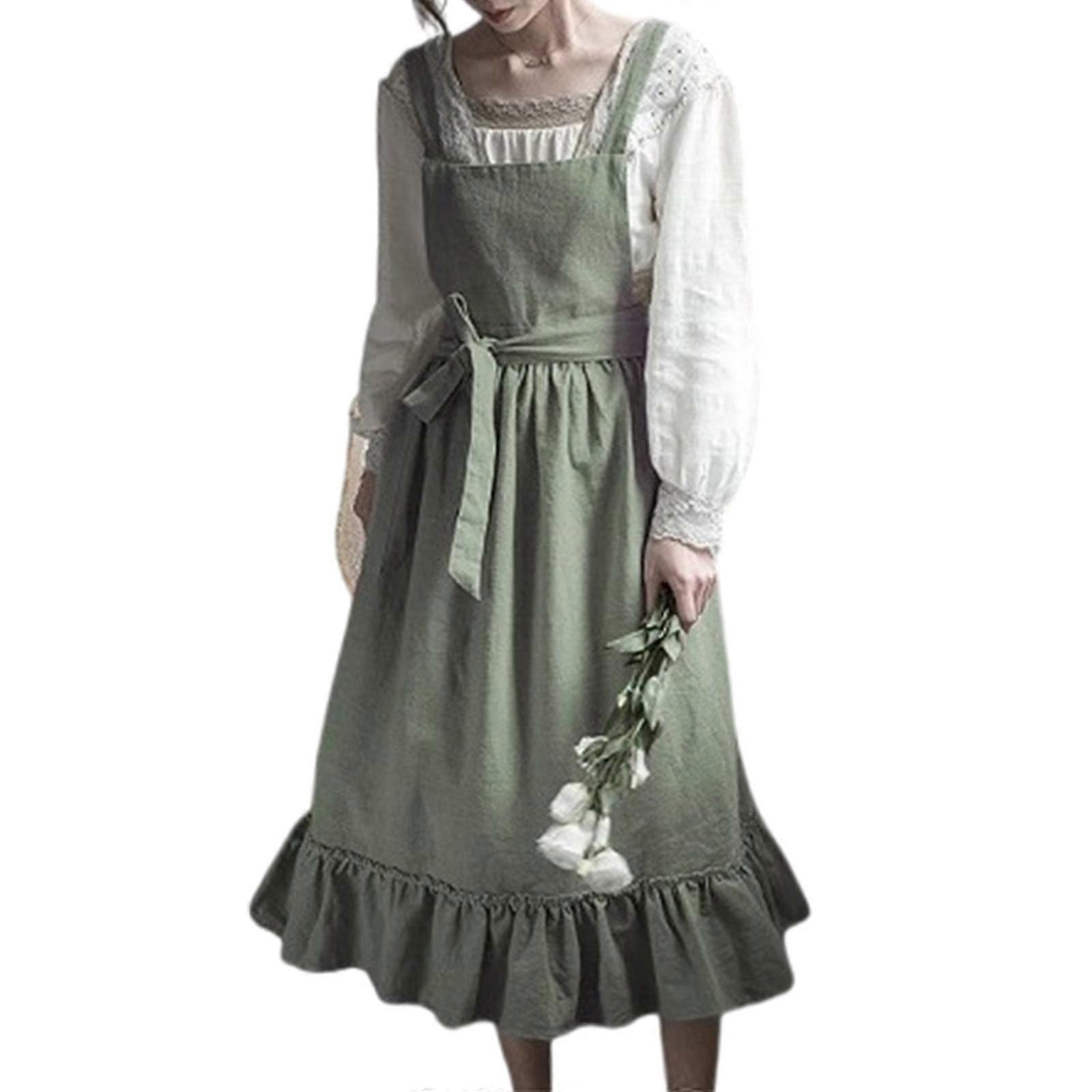 Women's Vintage Cotton Linen Adjustable Ruffle Apron with Pockets Maid Costume Pinafore Dress for Cooking and Crafting taro purple Washed cotton-Good