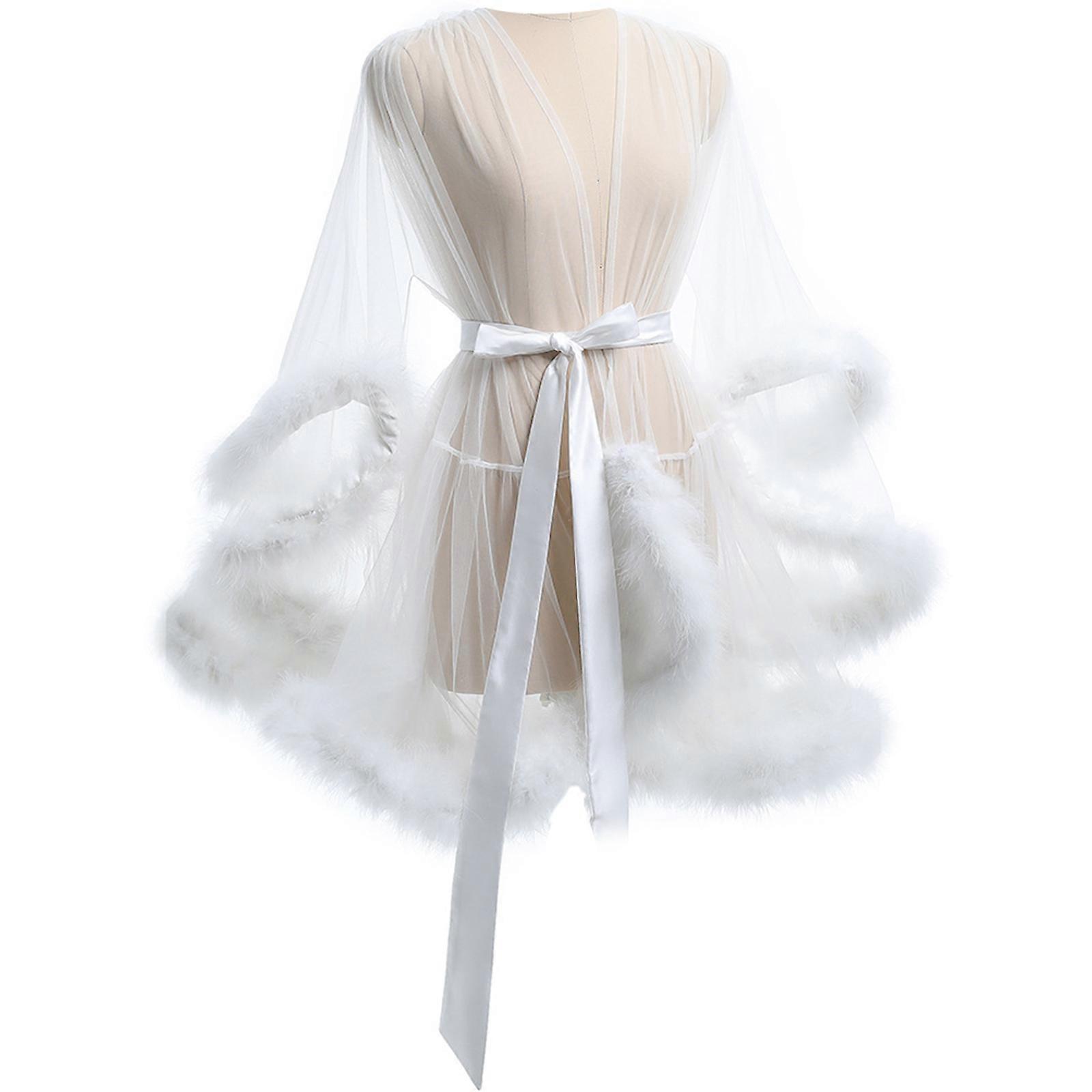 Women Sheer Mesh Kimono Robe See Through Babydoll Cover Up with Satins Sash Furry Trim Long Sleeve Lingerie Nightgown White M