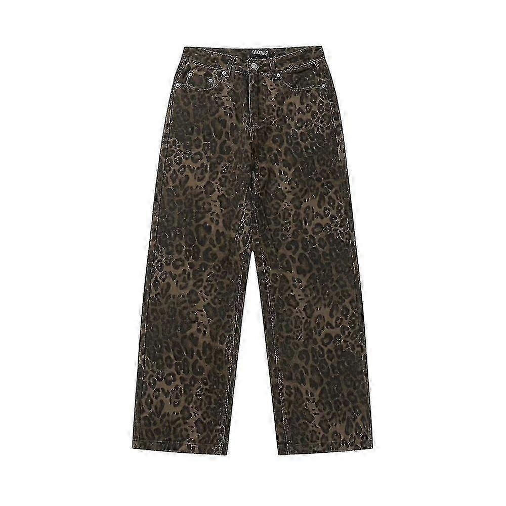 Women's Oversize Wide Leg Tan Leopard Jeans Denim Pants HJ