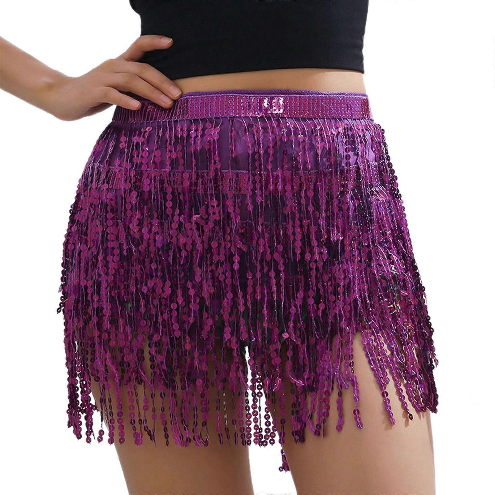 Women Sparkly Changing Color Sequins Tassels Tiered Mini Skirt Tie Belly Dance Hip Scarf Latin Fringed Festival Outfit Purple