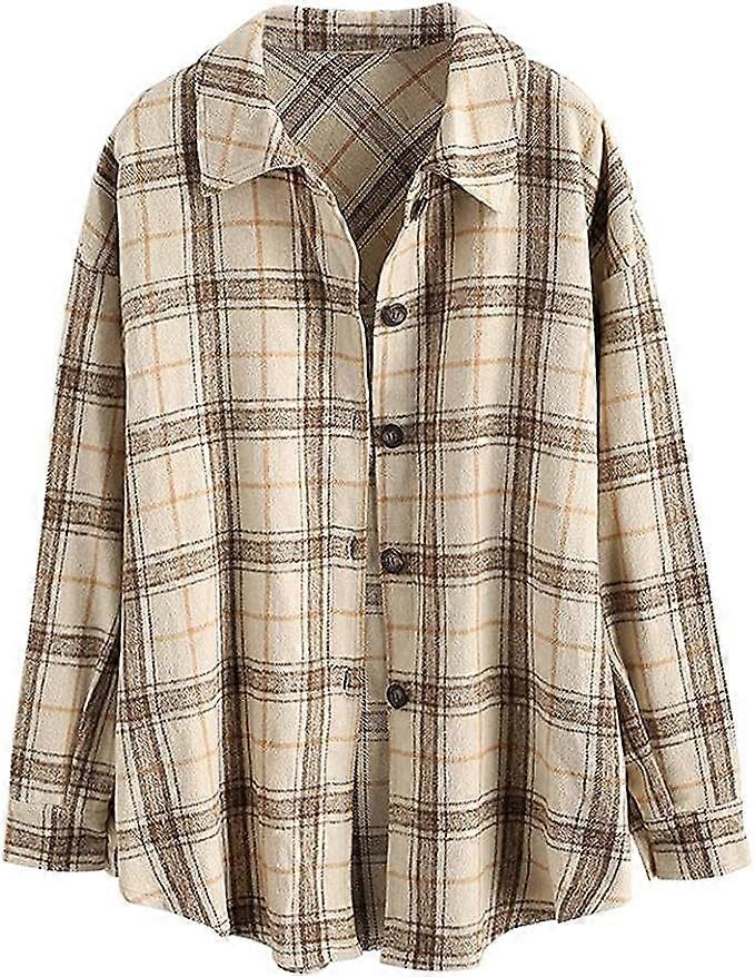 Women's Plaid Long Sleeve Shirt Button Down Wool Blend Thin Jacket Casual Blouse Tops with Pocket