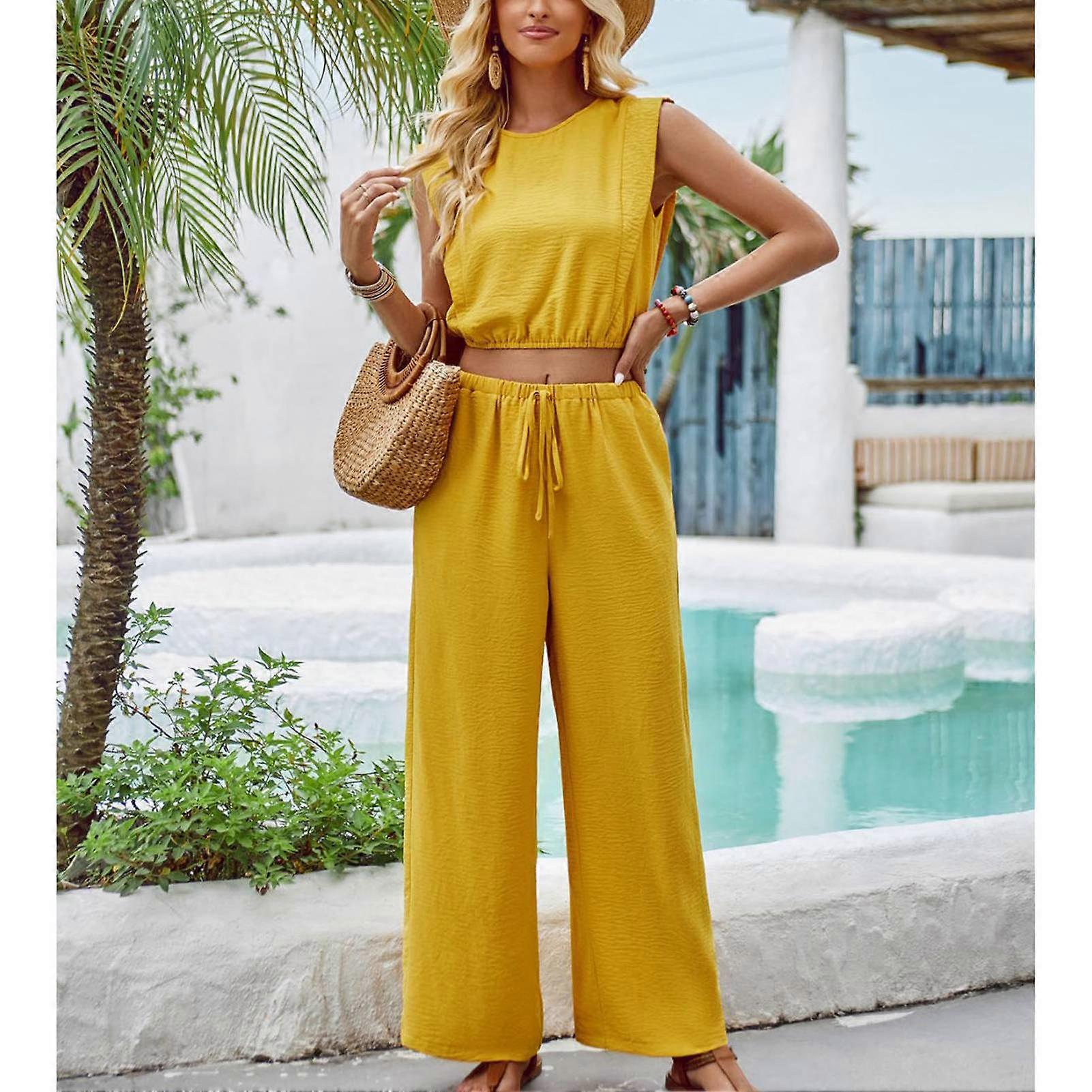 Women's 2 Piece Outfits Sleeveless Short Top High Waist Pants Set Solid Color Round Neck Tops Pants Outfits Yellow M