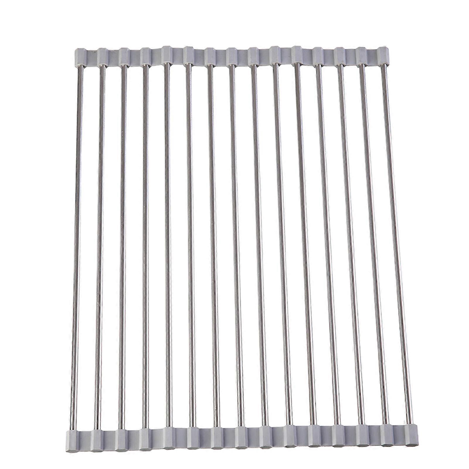 Roll Over Sink Drying Rack Foldable Kitchen Rolling Drainer Stainless Steel Drying Mat For Counters Feature: · Material: Stainless steel · Color: · Product net weight:200g/0.44 lb · Product gross weight:200g/0.44 lb · Product size:37x29cm/14.56x11.41in · Packing size:37x5x5cm/14.56x1.96x1.96 in Description: QUALITY : Made of 304 Stainless Steel with construction, the cutting board over sink is sturdy, non-slip, waterproof; not easy to bend by heavy cookware. A great portable stainless steel rolling rack for apartment and home accessories. MULTI-PURPOSE: This folding sink drying rack can be used as a drainer for drying kitchenware, such as washed bowls, pans, glasses, cups, plates, cookware, cutlery, saucepan, mugs; but also as a vegetable colander for fruit wash; or as a non-slip trivet mat for hot pots or bakeware countertop. The drying mat can also be used as a kitchen sink caddy, sink cover, camping sink mat, sponge, over the sink colander, kitchen sink organizer for RV storage. SPACE SAVING : The rollable kitchen drying rack is designed with 15 stainless steel pipe, fixed firmly by, which makes it easy to use, lay flat, clean or put away for storing in cabinet when not in use, saving your counter space. This drying rack over the sink adjustable frees up much counter space then traditional drainer. for house organization and storage. Great gifts for your parents, families and house warming gifts for home. FOOD SAFE AND HEAT counteractive : The draining rack with food safe grade coated, dishwasher safe. As a trivet for cool down hot pans from oven or stovetop, or thawing articles from refrigerator. Space-Saving, Foldable- Quickly and easily roll it up for storage, helping to declutter your kitchen. This is a great space thrift but also easy to clean. It is suitable for both hand washing and machine washing. Packing Include: · x1Dish Drying Rack