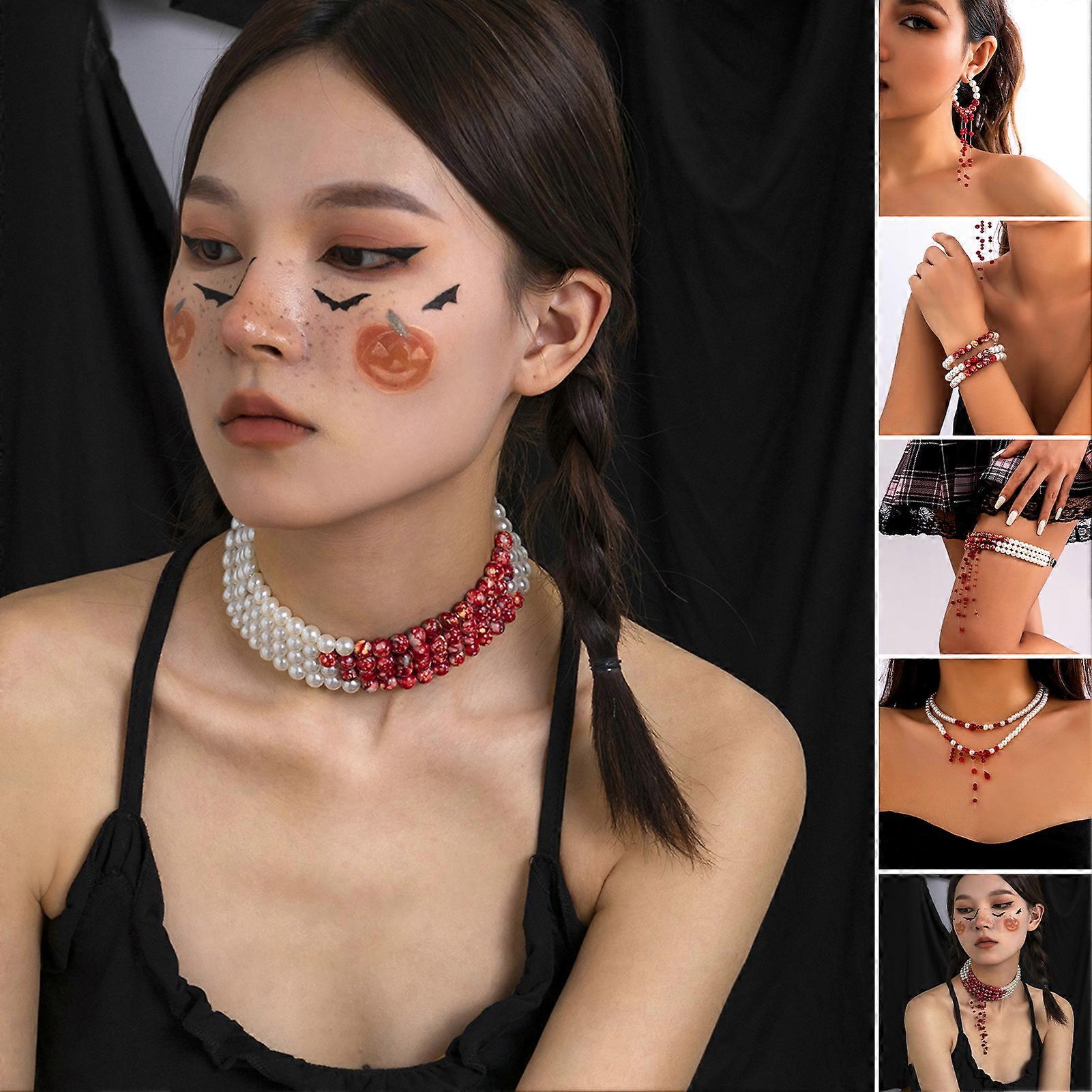 Halloween Jewelry Gothic Style Blood Pattern Imitation Pearl Necklace Earrings Bracelet Thigh Chain Fashion Multi-layer Beaded Necklace Gothic Party J