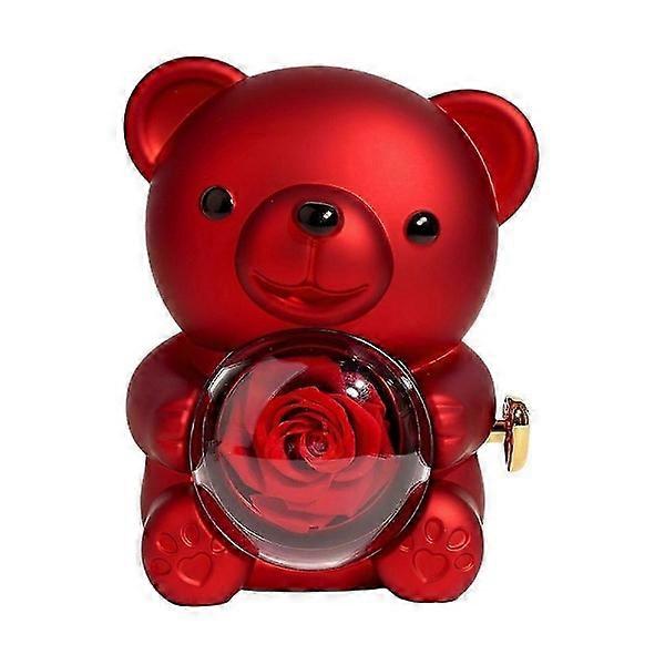 Preserved Rose Teddy Bear Gift with Heart Necklace Eternal Flower Bear Gift Box (Red)