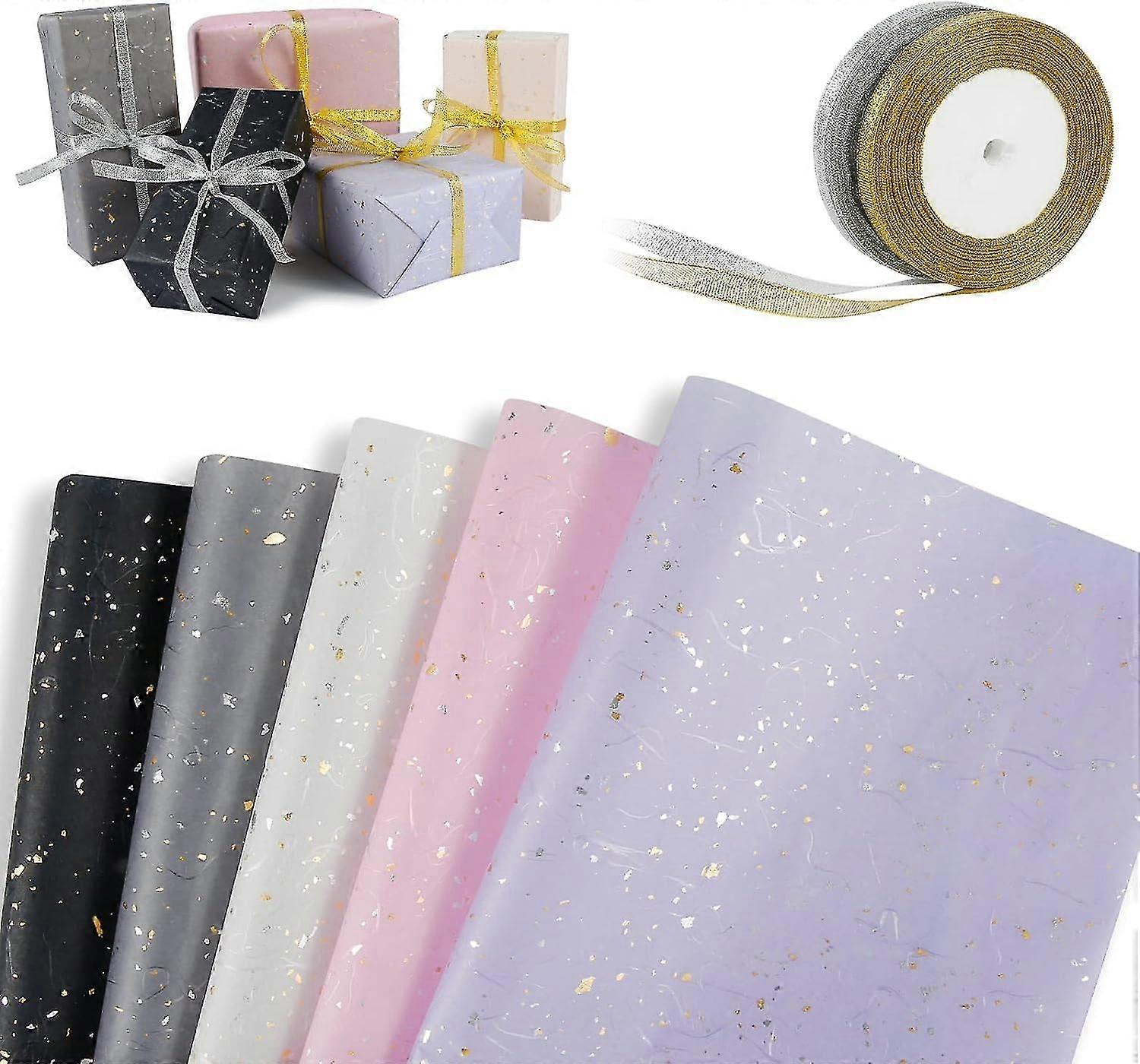 Wrapping Paper, 50 sheets of gift wrapping paper, dreamy gold and silver paper in 5 colors, comes with two gold and silver ribbons, perfect for