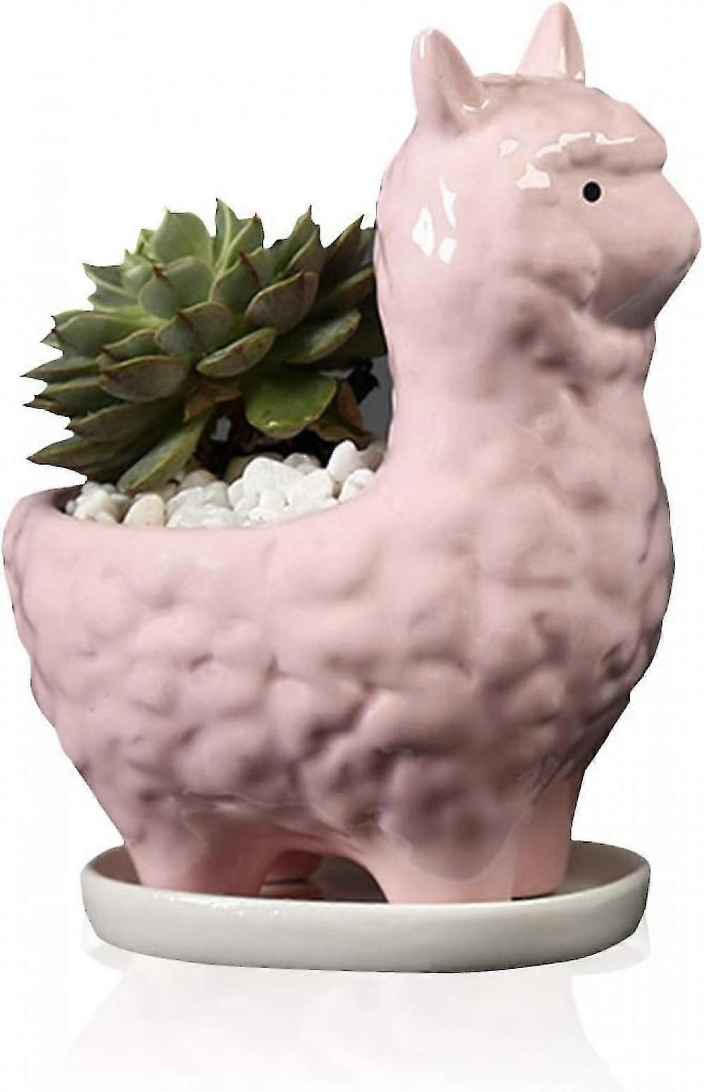Mike Cute Alpaca Succulent Planter Pot With Drainage Tray, White Ceramic Cactus/flower Container, Animal Llama Bonsai Holder For Indoor Plants - Pink