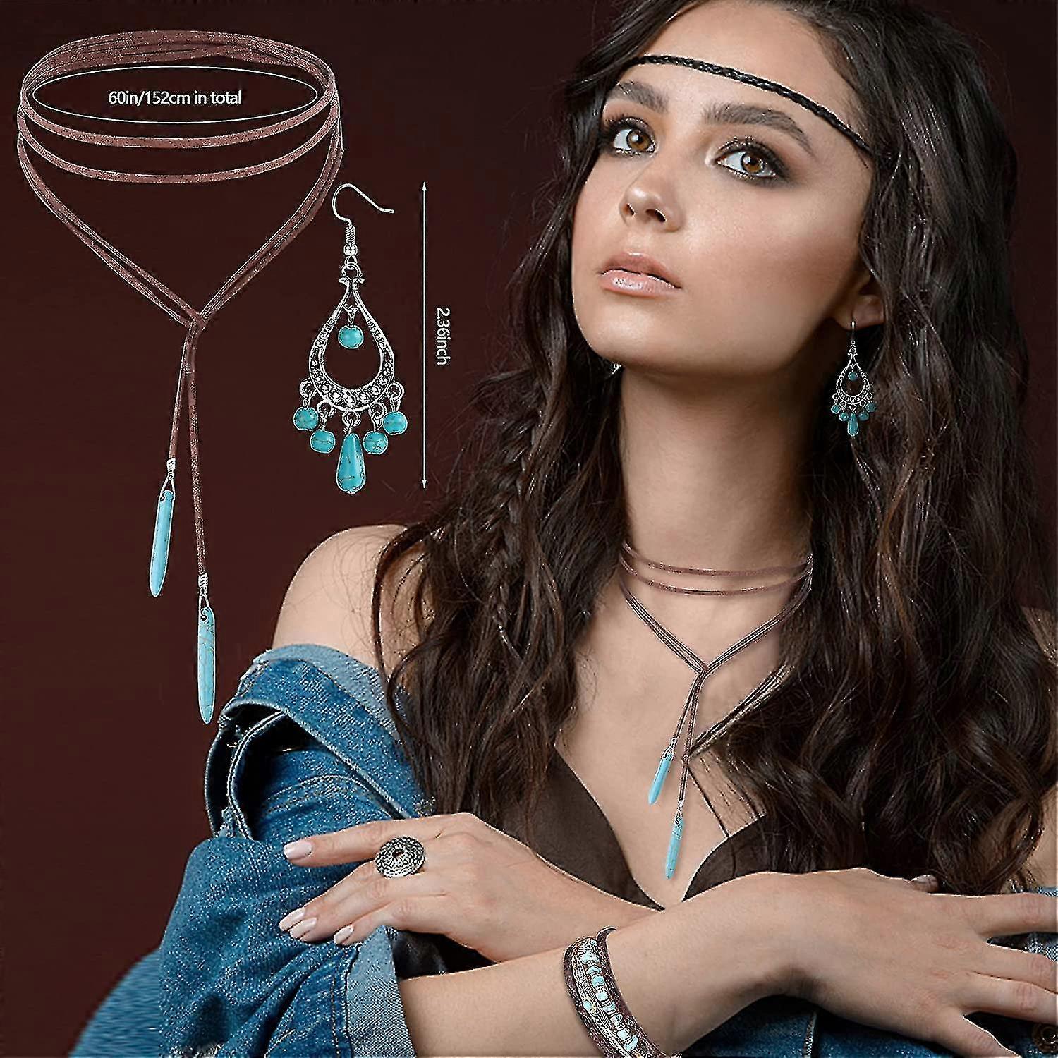 -8 Pieces Turquoise Jewelry Boho Bohemian Jewelry For Women,turquoise Necklace Vintage Turquoise Statement Dangle Earrings Boho Leather Cuff Brace Xin