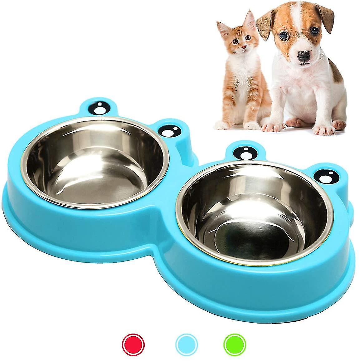NonSlip DesignFour AntiSlip pads on the bottom of this bowls tray,prevent the bowls sliping while your little pet is consuming food and water,also protect the floor from attrit and wet.^ Double Bowls DesignTwo Stainless Steel Bowl for your dog,puppy,little cats,they can eat food and drink water with one dinner set,an ideal tool for your pets eatting.^ Easy to CleanThe two stainless steel bowls is seperated with the whole bowl tray,which you can take our easily and wash,very convenient and thoughful use.^ High Quality MaterialThis Pet double bowls are made of ecofriendly foodgrade material, stainless steel and PP resin,it is totally nontoxic,safety and healthy for your pets eating.^ Frog ShapeThis Double dog bowls is designed as fog shape to attract your dog/cat to eat,raise their appttie on food,make your feeding work more satisfying. ^